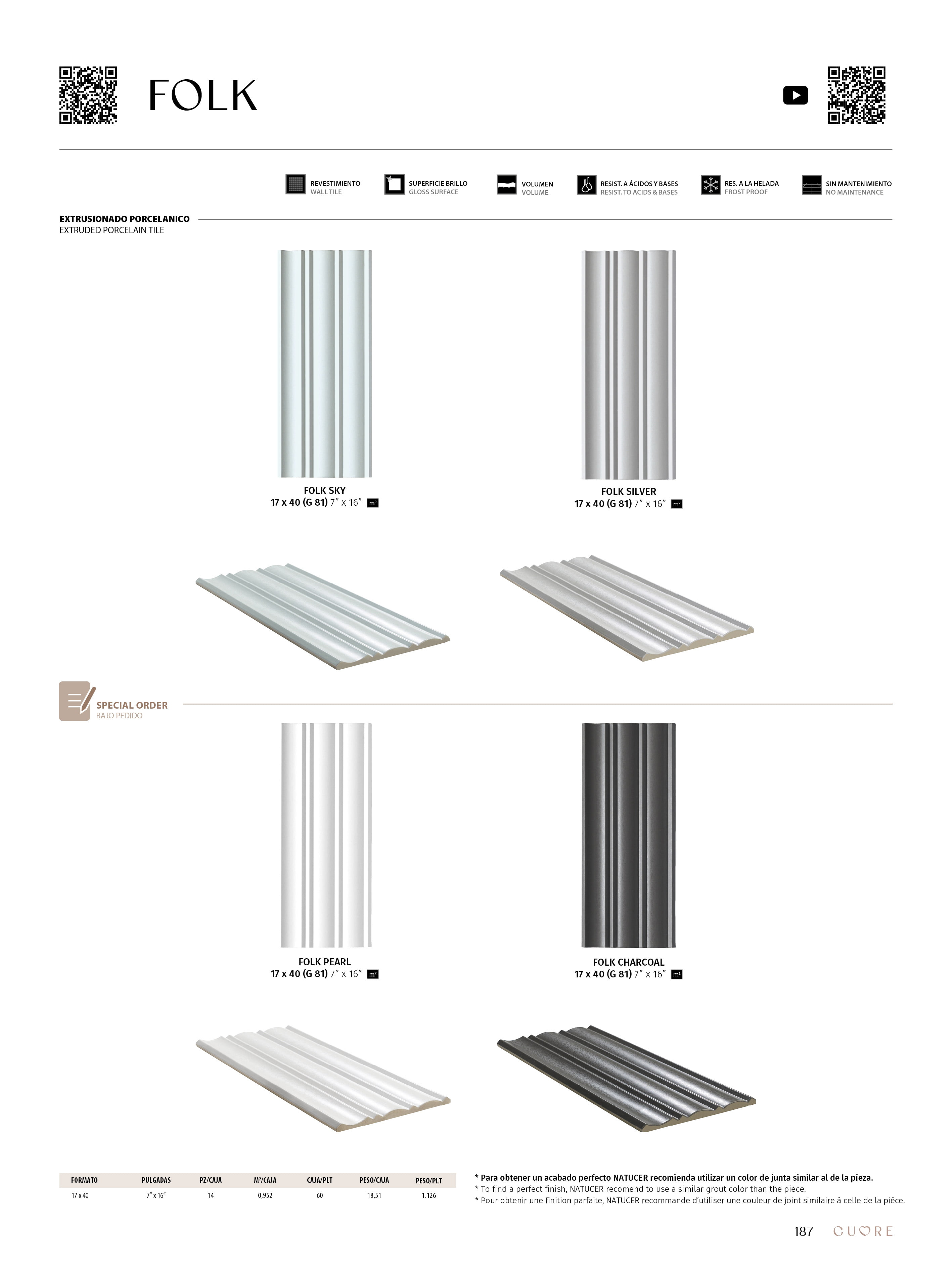 Elegance, relief and sophistication are the characteristics that define the Folk series. This volumetric extruded porcelain tile with gloss finish and pearly tones offers greater customization and creativity when designing any space, helping to create a more unique and personal atmosphere.