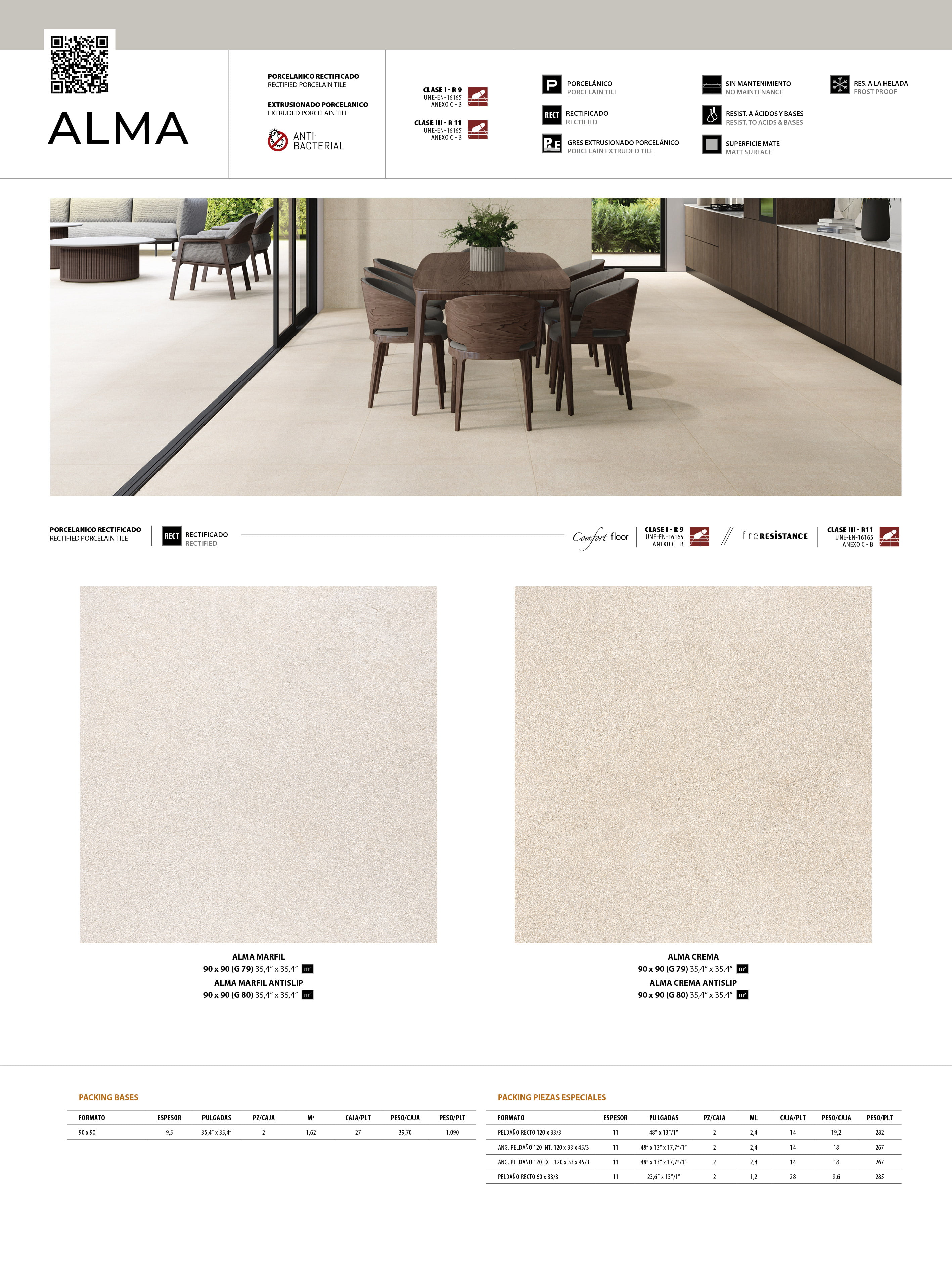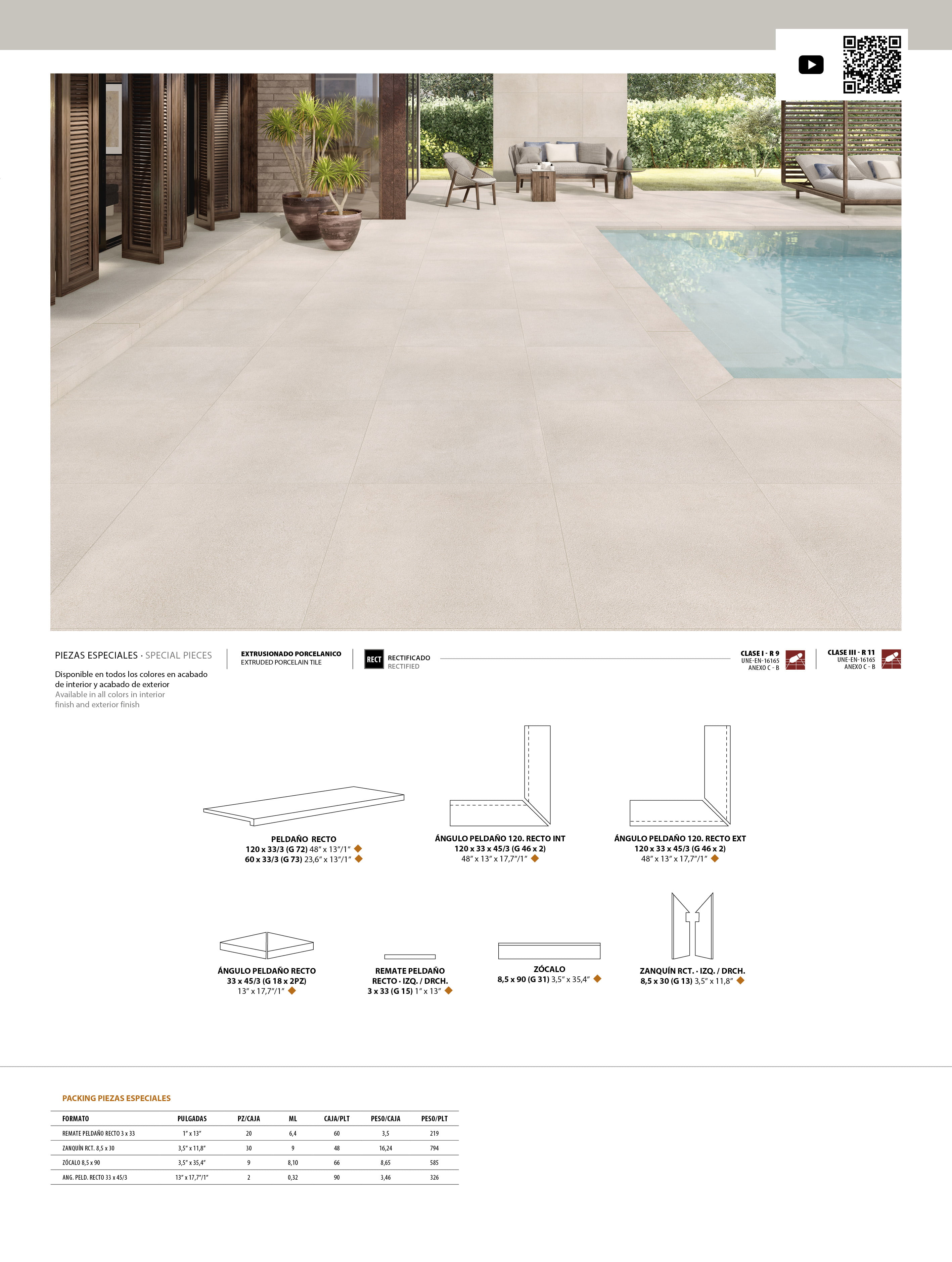 ALMA MARFIL ANTISLIP 90x90 · 35,4''x35,4'' · PELDAÑO 120 RECTO ALMA MARFIL ANTISLIP 120x33/3 · 48''x13''/1'' · ÁNGULO PELDAÑO 120 RECTO INT. ALMA MARFIL ANTISLIP 120x33x45/3 · 48''x13''x17,7/1''CEMENT BRICK BEIGE 7x60 · 3''x24''