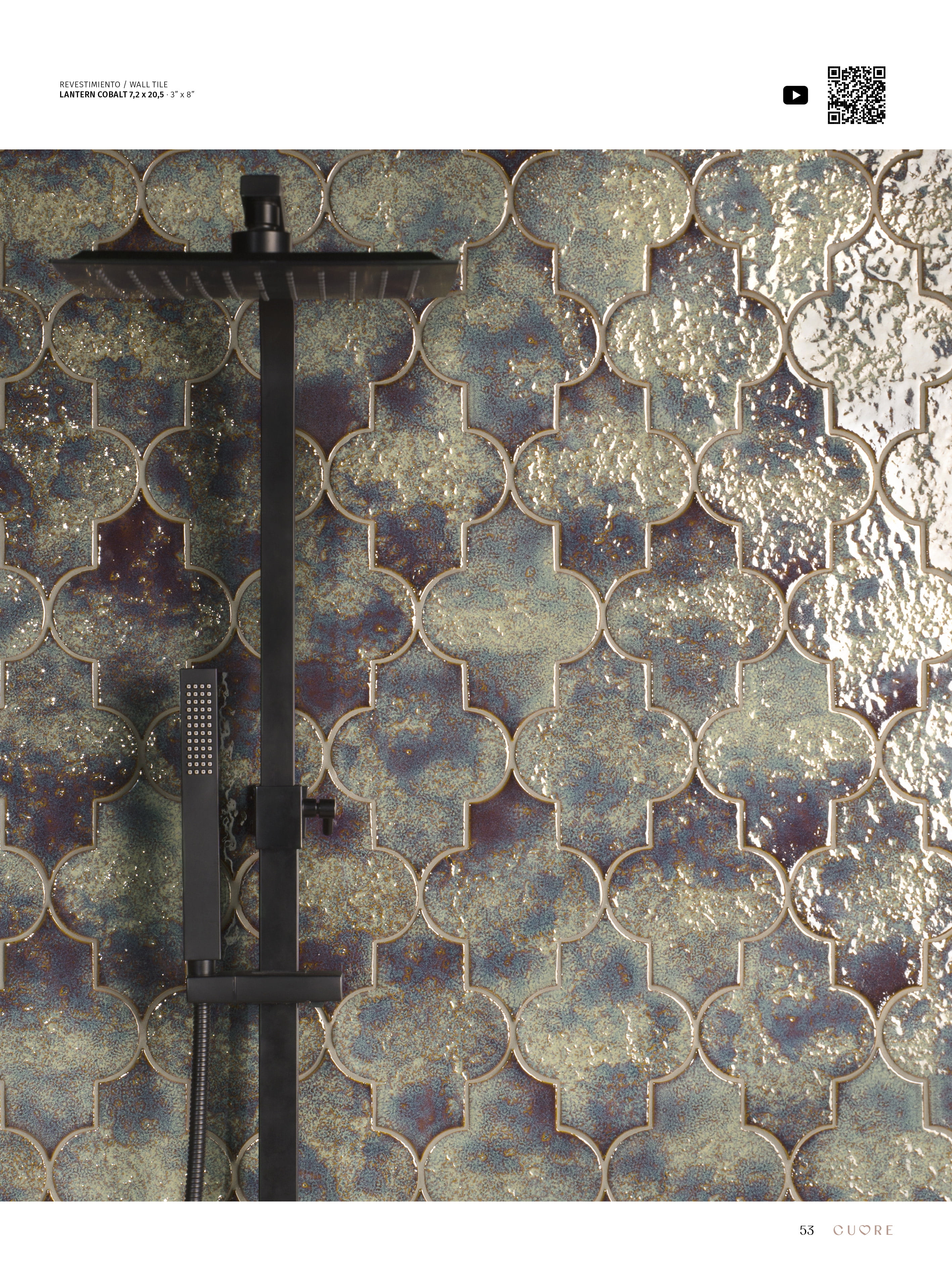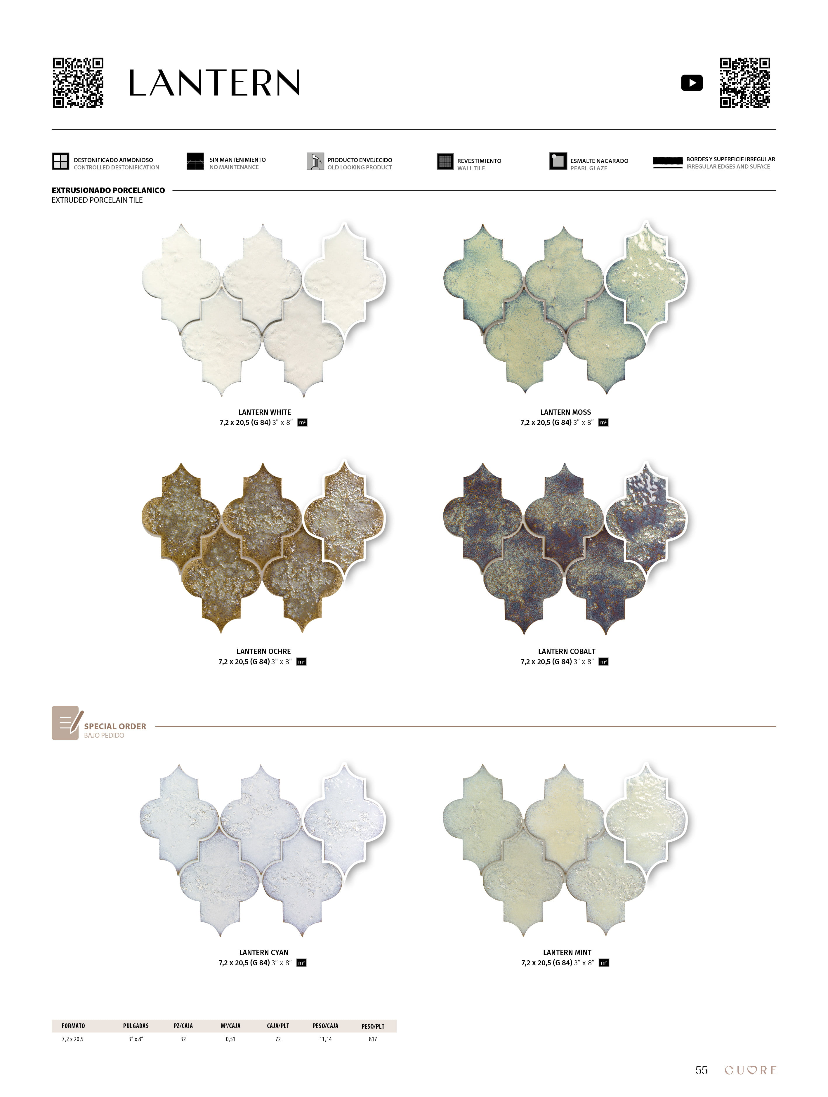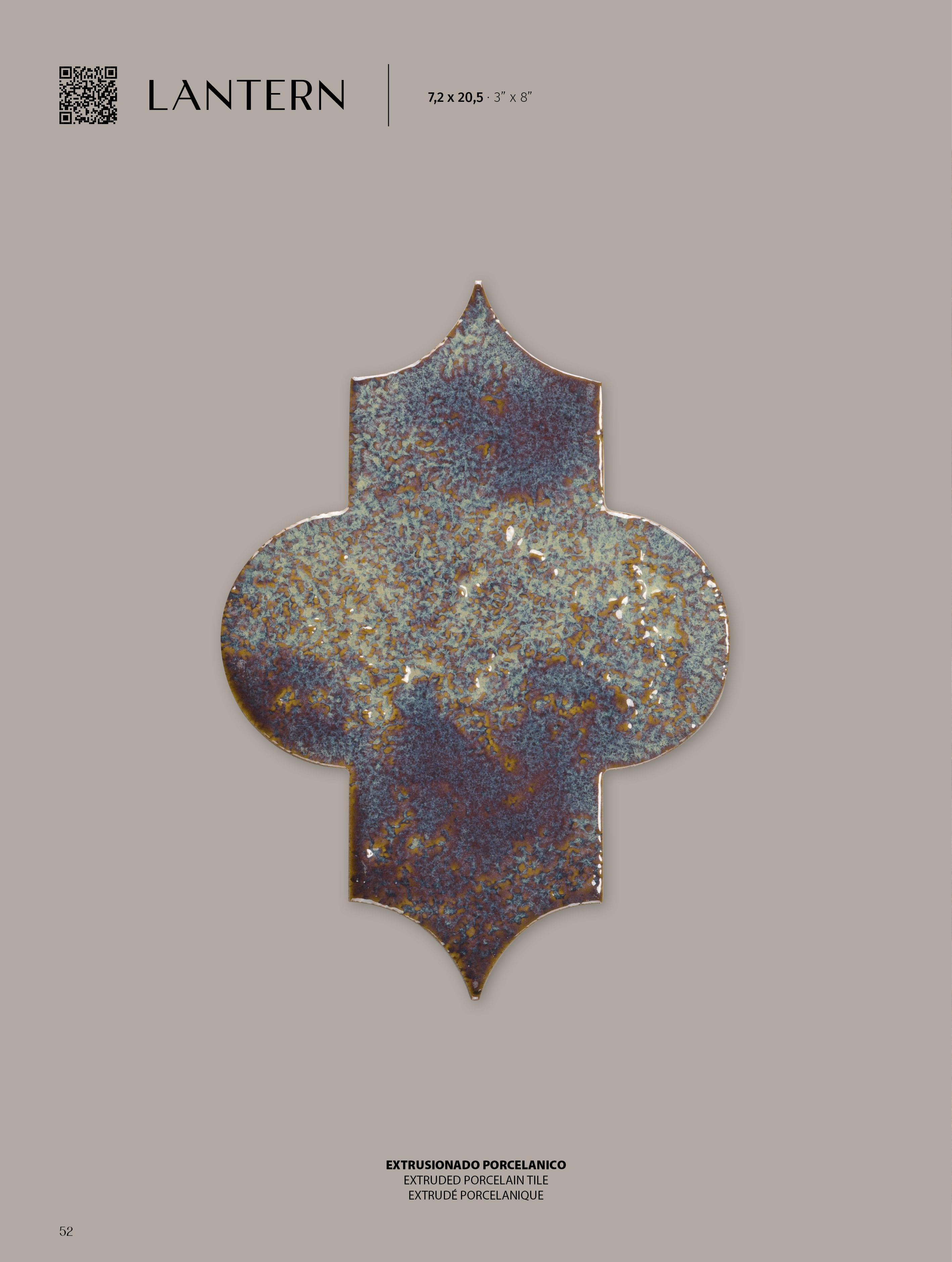 The LANTERN collection, inspired by traditional Arabic lanterns, is an extruded porcelain tile in a 3"x8" format. Its reactive glaze and aged-effect surface, along with its unique reliefs, make each piece distinct, evoking the craftsmanship and warmth of these classic lanterns. This makes it an ideal wall covering to decorate spaces with style and sophistication.