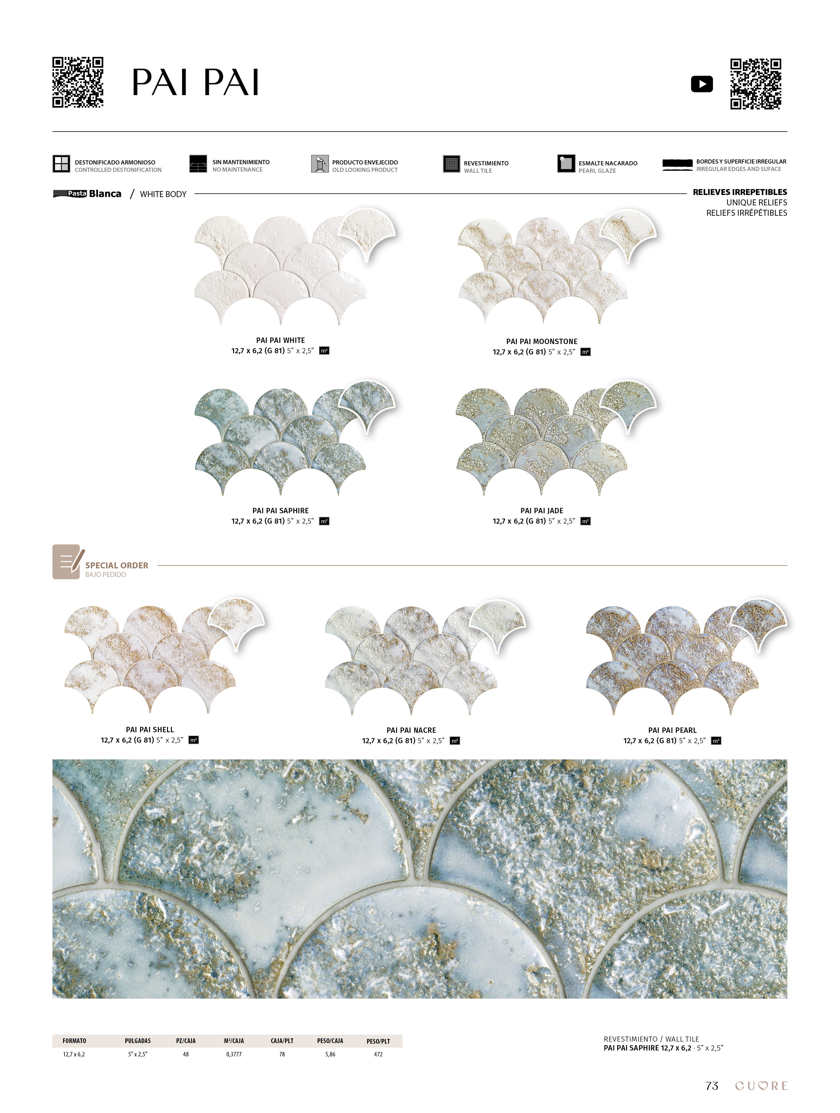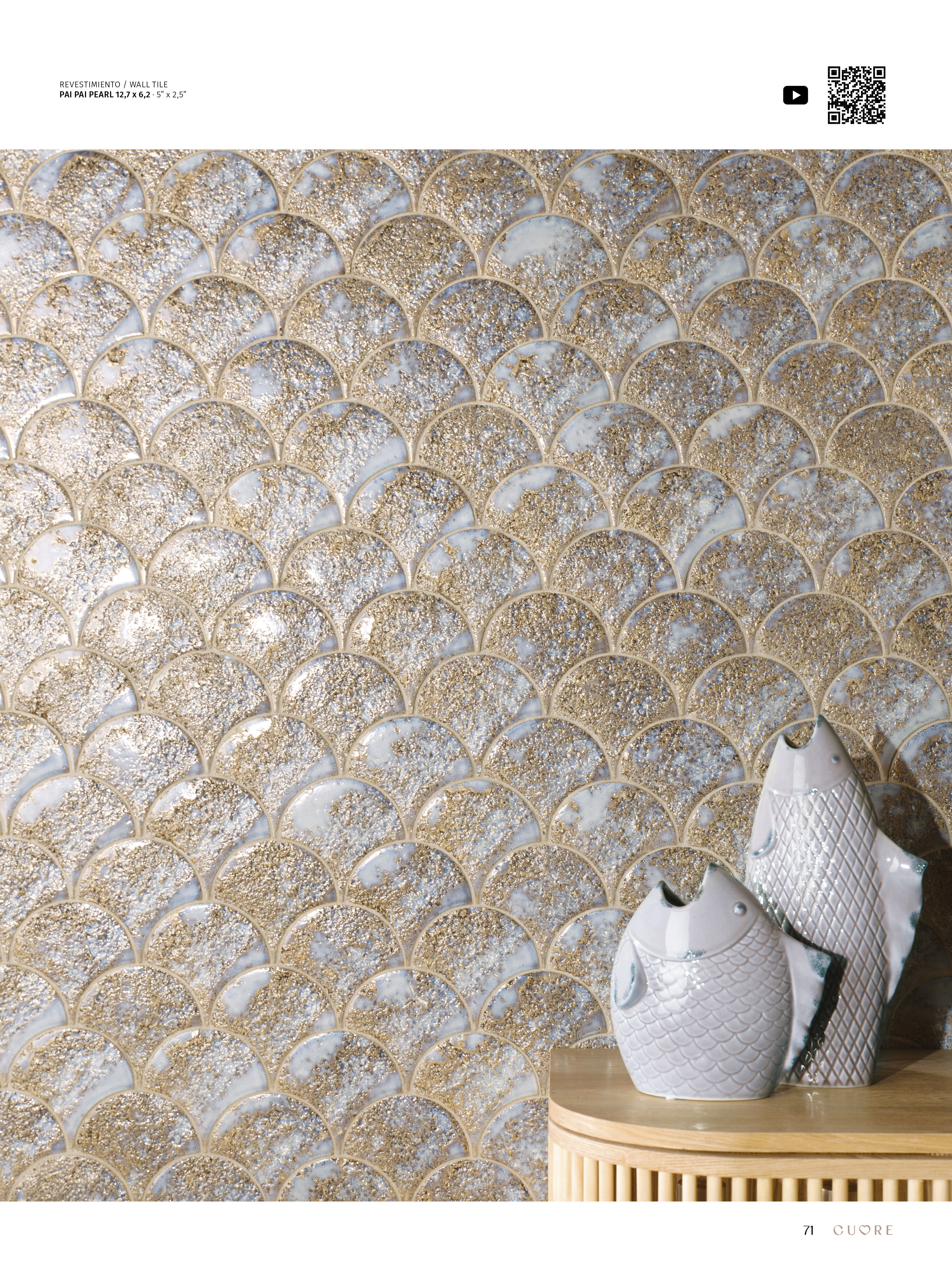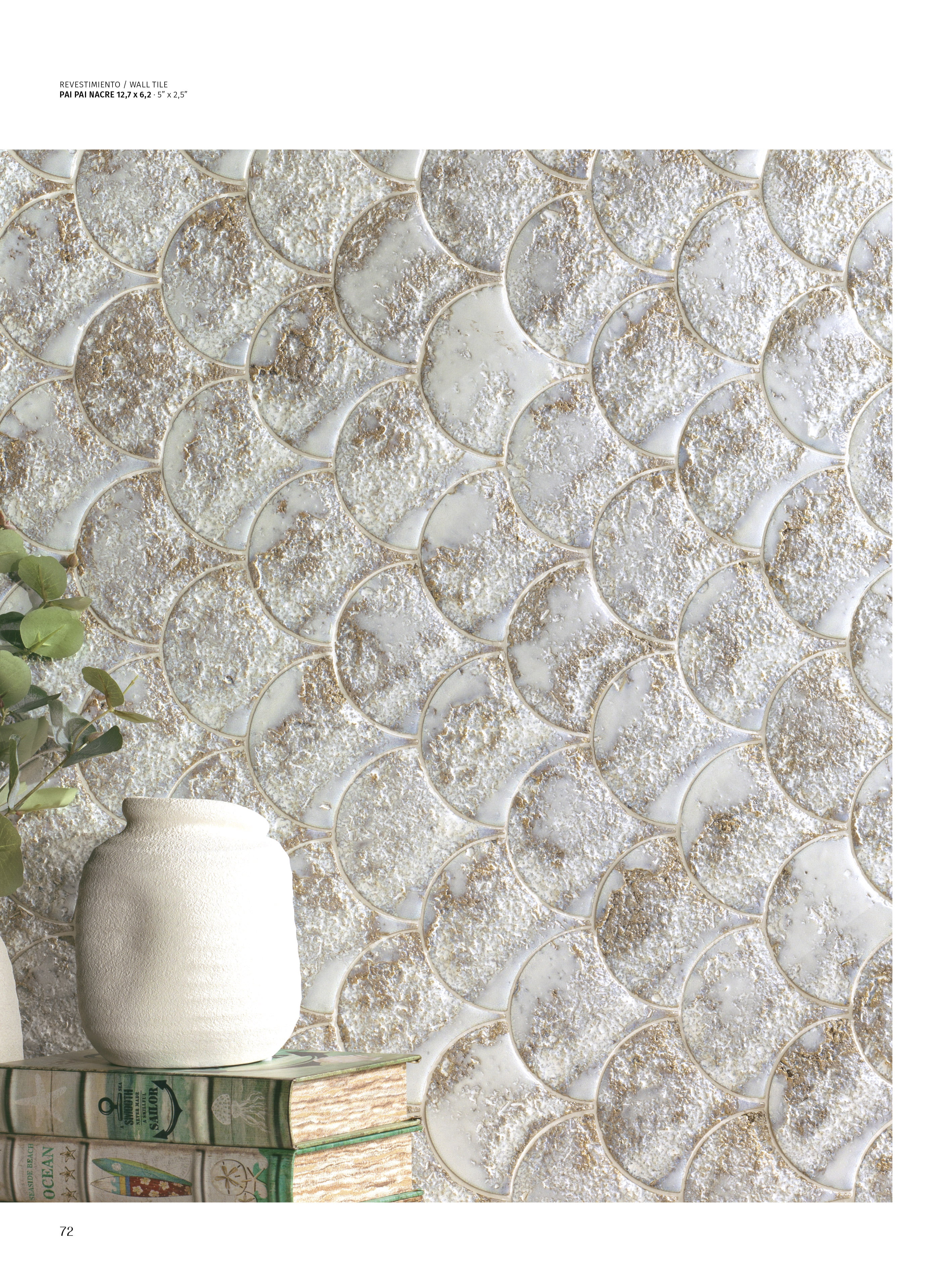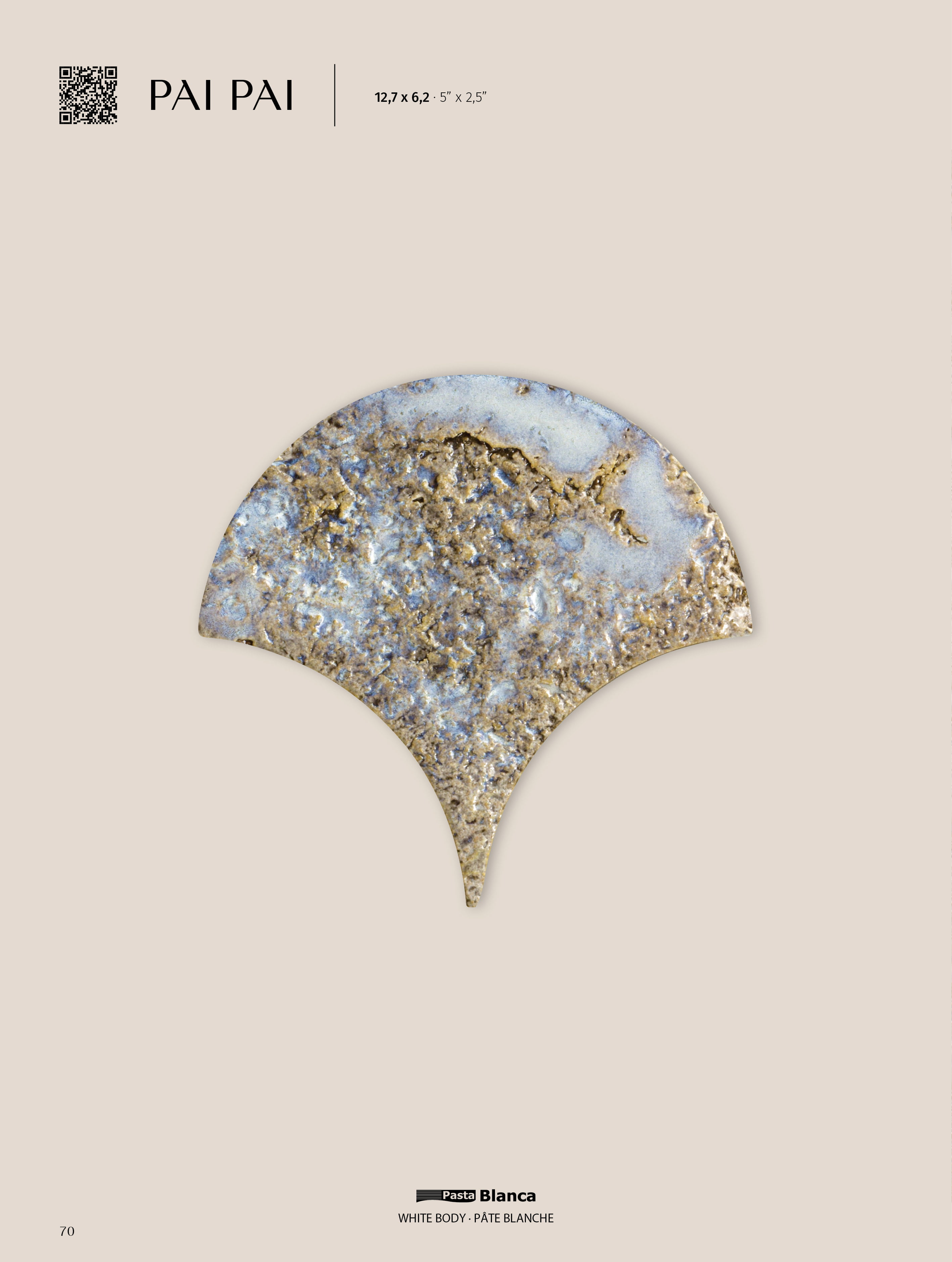 The PAI PAI white body tile, with its distinctive fish scale shape and 5"x2.5" format, is designed to enhance walls with a unique style. Inspired by volcanic stone, its aged effect and reactive glaze make it the ideal choice for creating elegant, personalized spaces, where each piece stands out as unique.