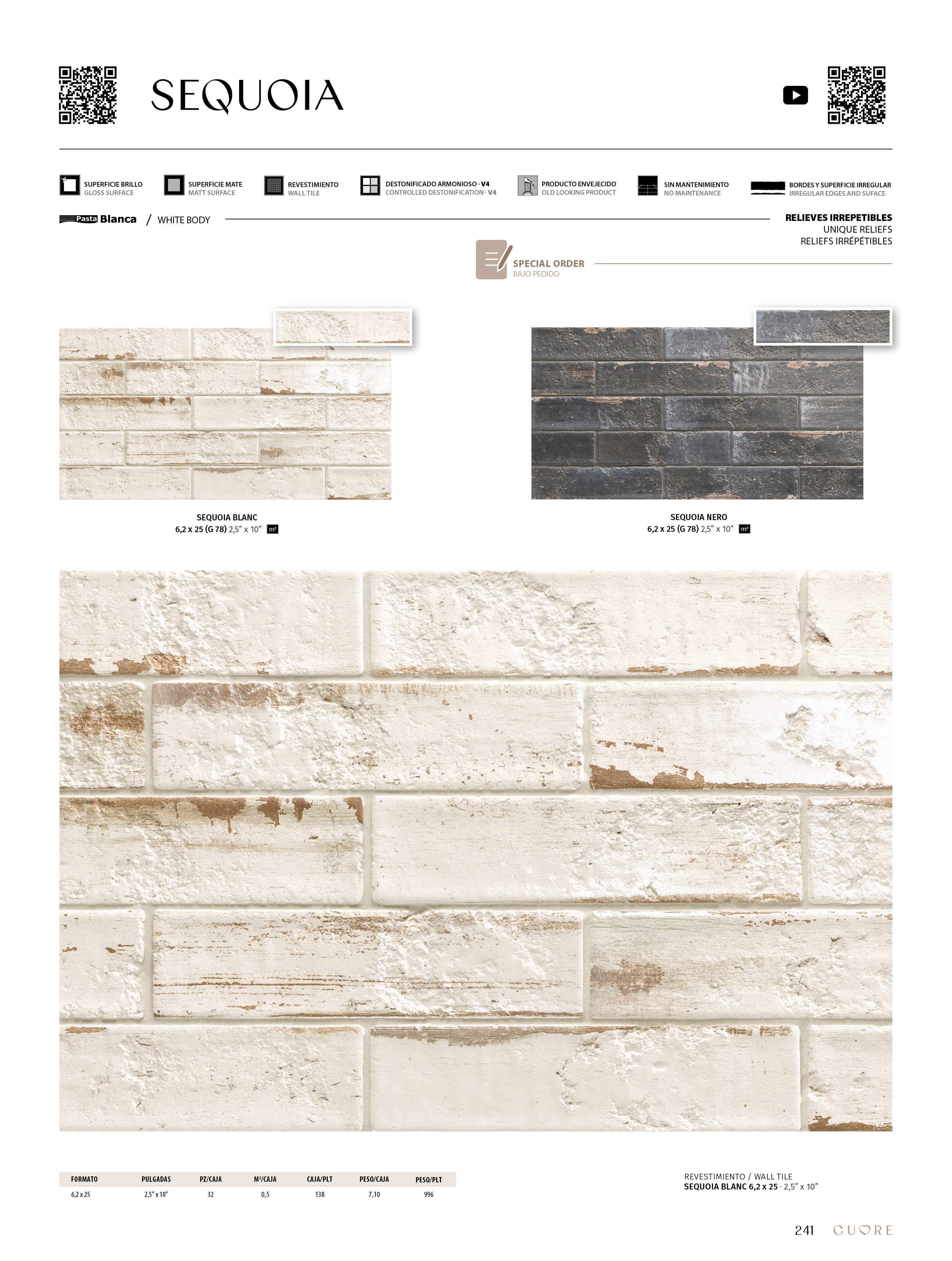 The new collection of Cuore by Natucer Sequoia, is a series with a worn appearance and prominent reliefs unrepeatable in each of its pieces, manages to convey the properties of warmth, comfort and elegance of natural wood. A brick format in gloss and matte in which each of its pieces is completely unique.