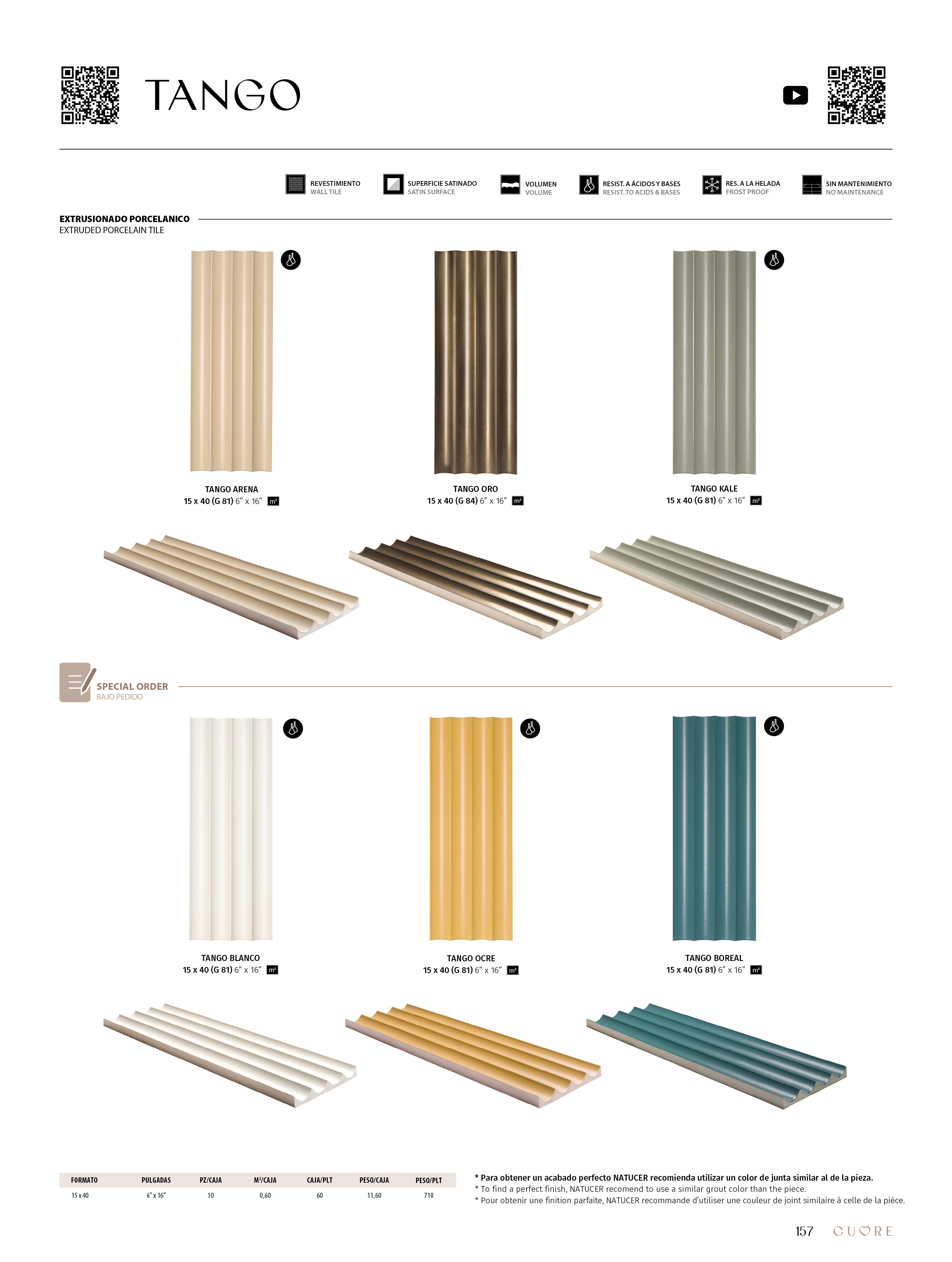 The new Tango series comes to life thanks to Cuore by Natucer, a 3D matt porcelain ceramic tile with gloss that offers depth and style, playing with light and shadow in a masterful way. Tango has a wide chromatic range that multiplies its charm and design possibilities. In addition, it fuses classic art with modern innovation, creating a unique visual experience.