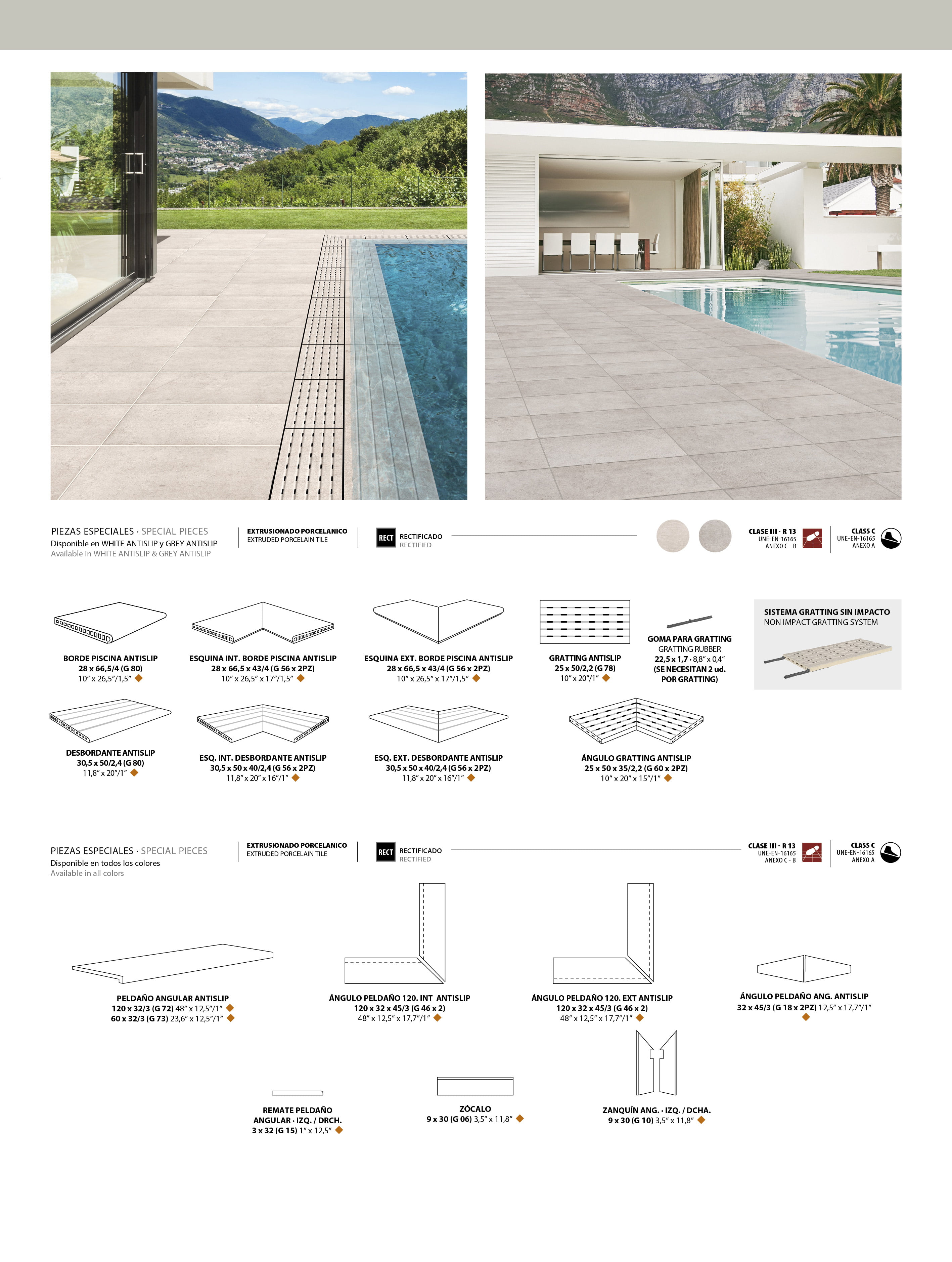 BORDE PISCINA ANTISLIP ESQUINA INT. BORDE PISCINA ANTISLIP ESQUINA EXT. BORDE PISCINA GRATTING ANTISLIP GOMA PARA GRATTING DESBORDANTE ANTISLIP ESQ. INT. DESBORDANTE ANTISLIP ESQ. EXT. DESBORDANTE ANTISLIP ÁNGULO GRATTING ANTISLIP INT./EXT. PELDAÑO ANGULAR 60 PELDAÑO ANGULAR 120 ÁNGULO PELDAÑO 120. INT. ÁNGULO PELDAÑO 120. EXT. ÁNGULO PELDAÑO ANG. REMATE PELDAÑO ANGULAR · IZQ./DRCH. ZANQUÍN · IZQ./DCHA. ZÓCALO |