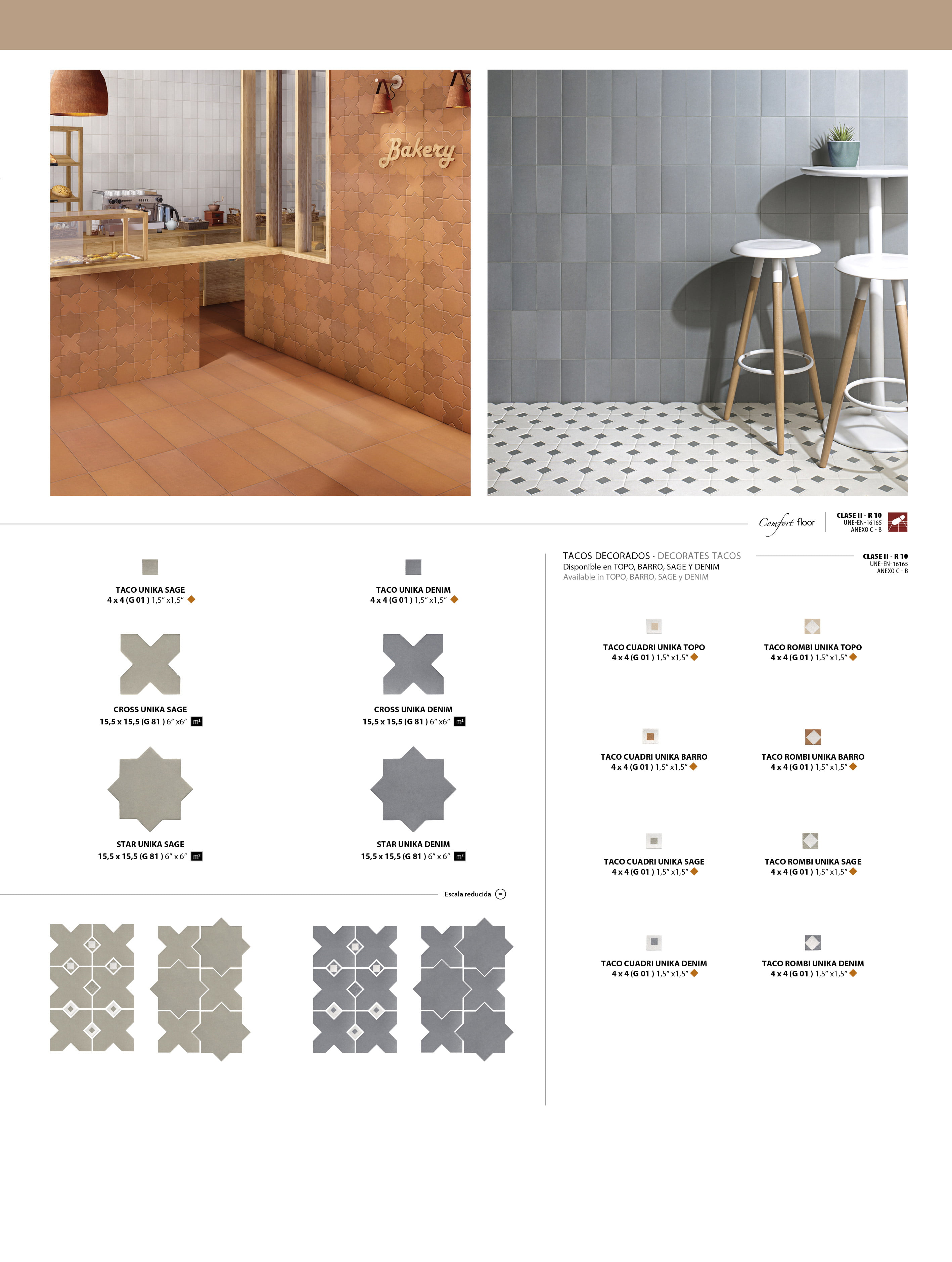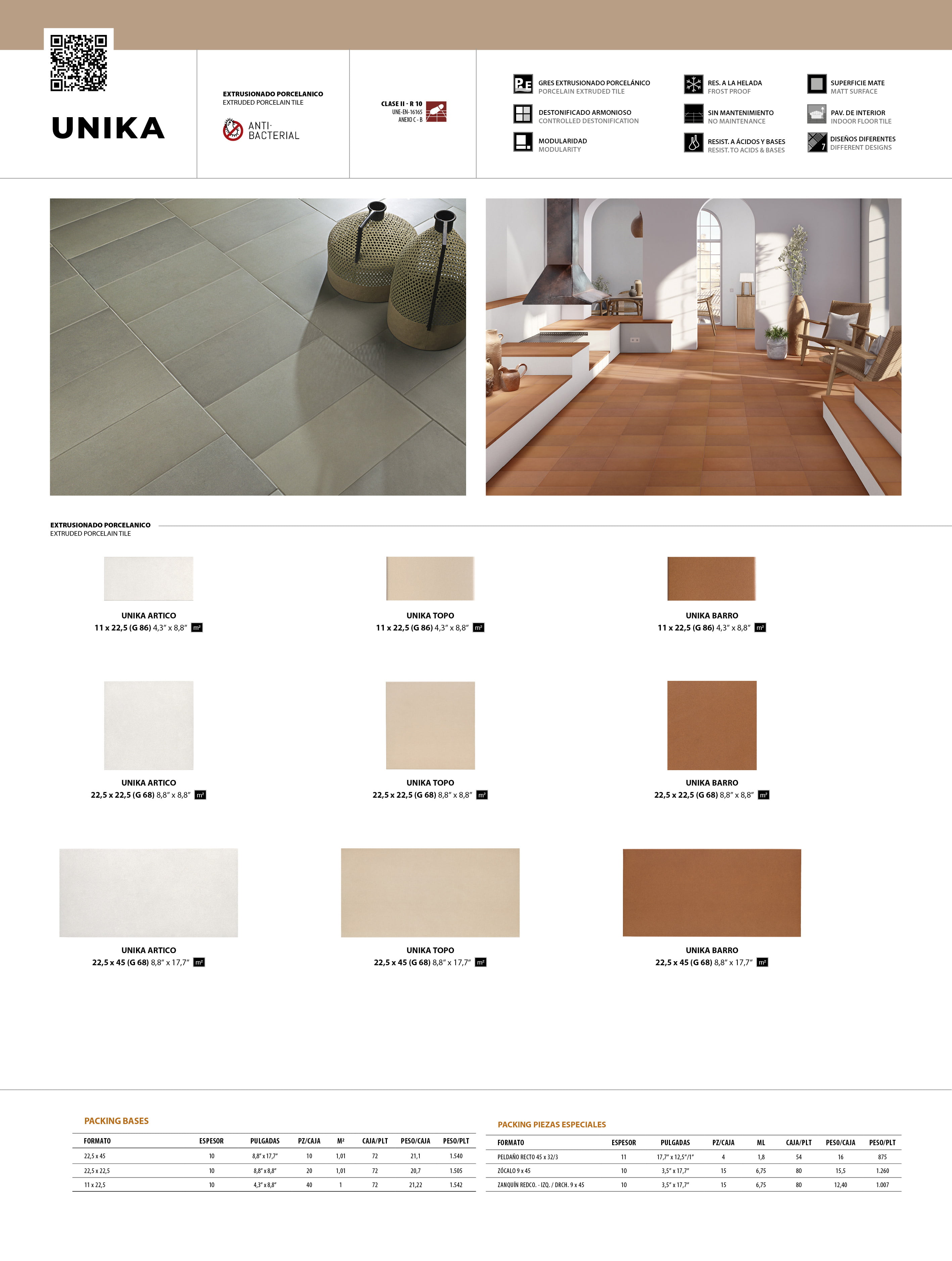 UNIKA TOPO 11x22,5 · 4,3''x8,8'' · UNIKA BARRO 11x22,5 · 4,3''x8,8'' · UNIKA ARTICO 11x22,5 · 4,3''x8,8'' · UNIKA SAGE 11x22,5 · 4,3''x8,8'' · PELDAÑO RECTO UNIKA BARRO 45x32/3 · 17,7''x12,5''/1''