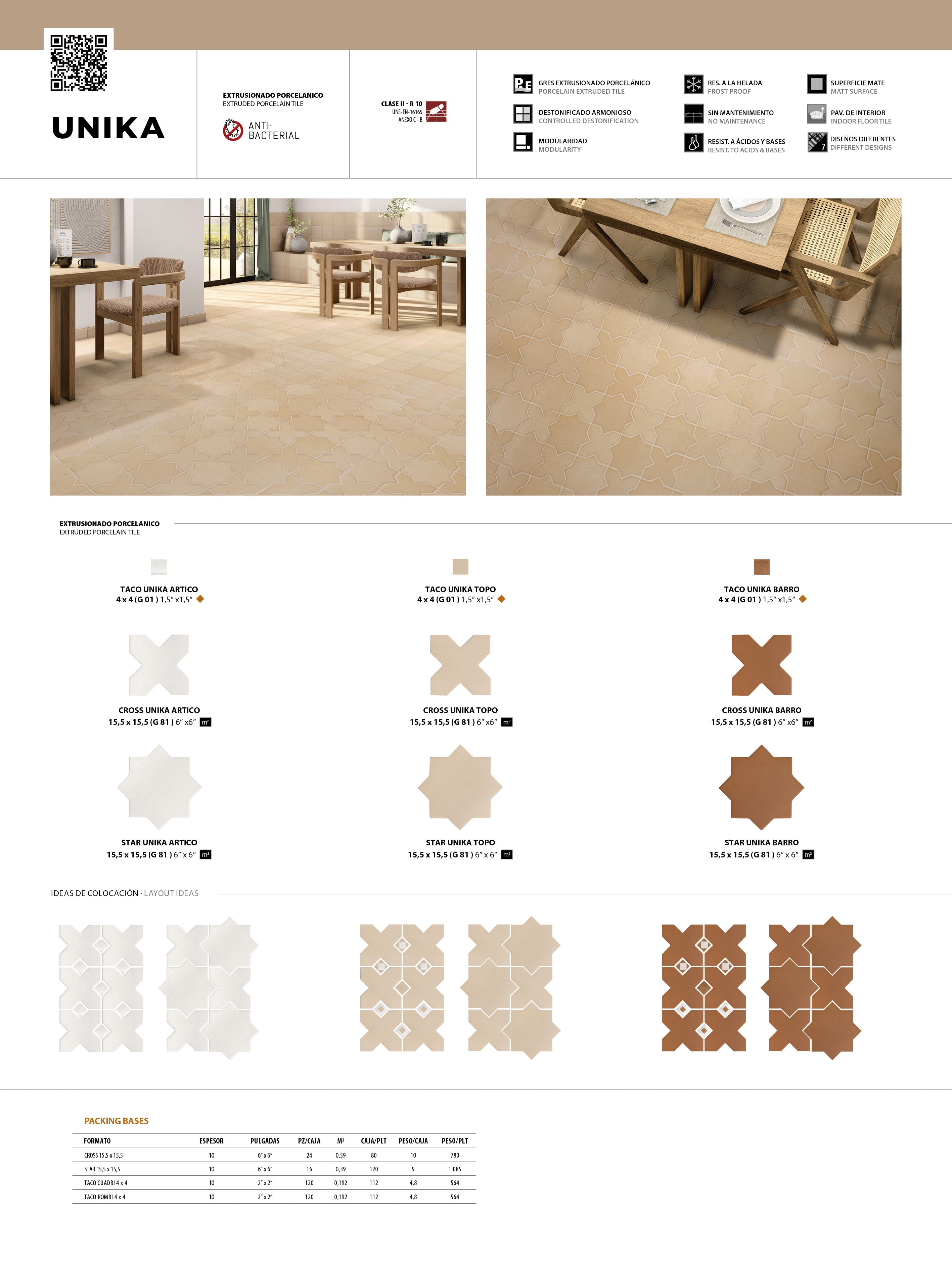UNIKA BARRO 22,5x45 · 8,8''x17,7'' · CROSS UNIKA BARRO 15,5x15,5 · 6''x6'' · STAR UNIKA BARRO 15,5x15,5 · 6''x6'' · UNIKA ARTICO 11x22,5 · 4,3''x8,8''