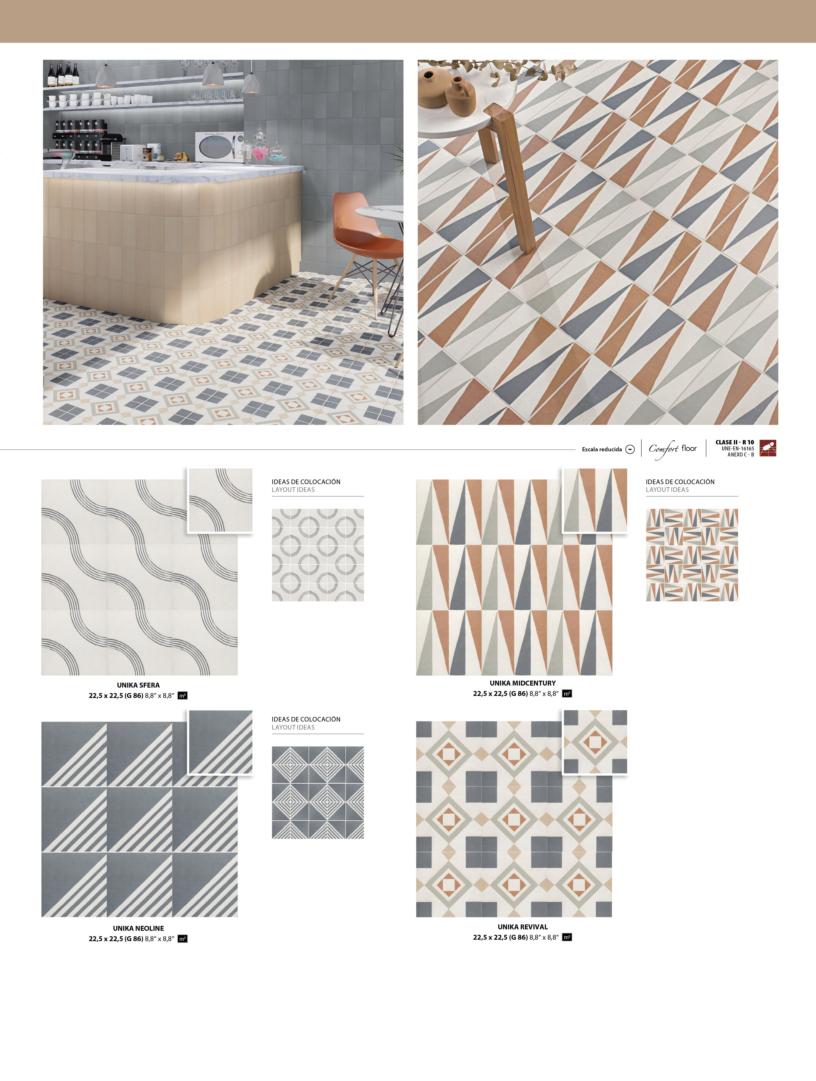 UNIKA DENIM 11x22,5 · 4,3''x8,8'' · UNIKA TOPO 11x22,5 · 4,3''x8,8'' · UNIKA REVIVAL 22,5x22,5 · 8,8''x8,8''