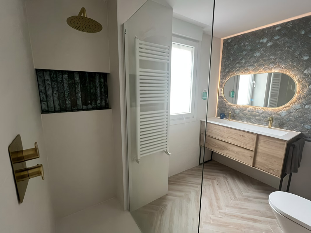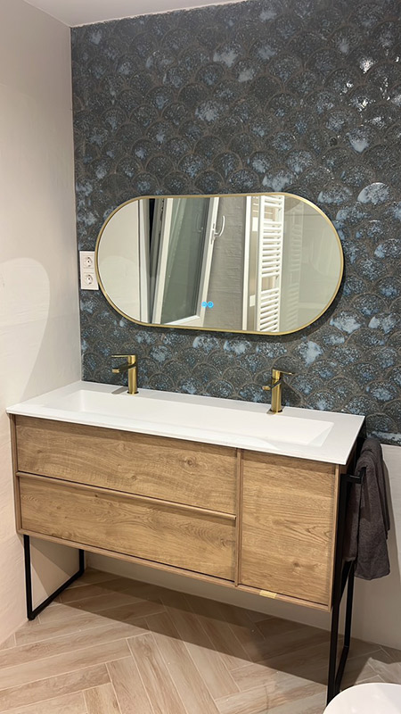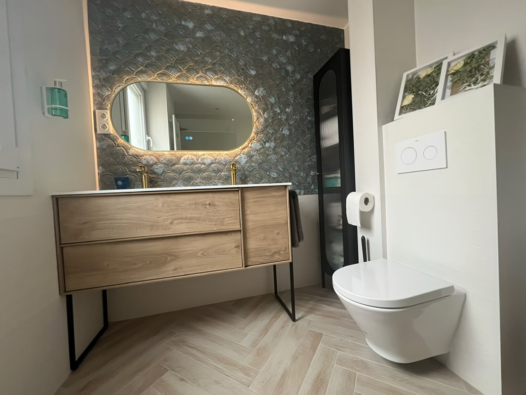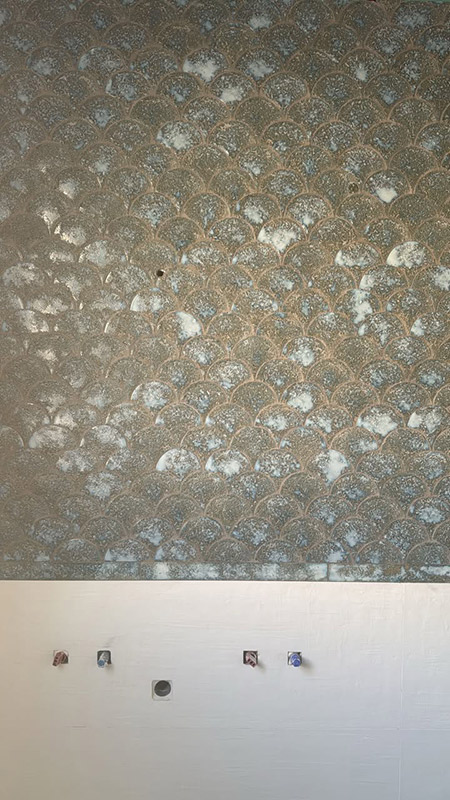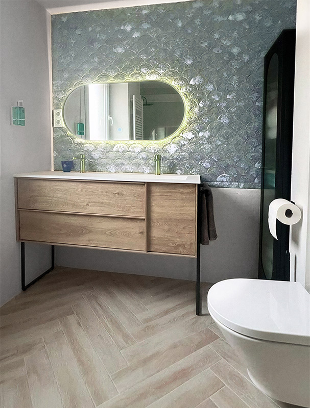 In this bathroom project, the Pai Pai series takes centre stage. Its distinctive scale-shaped ceramic cladding and aged effect add texture, depth and unique character to the wall, completely transforming the space.
