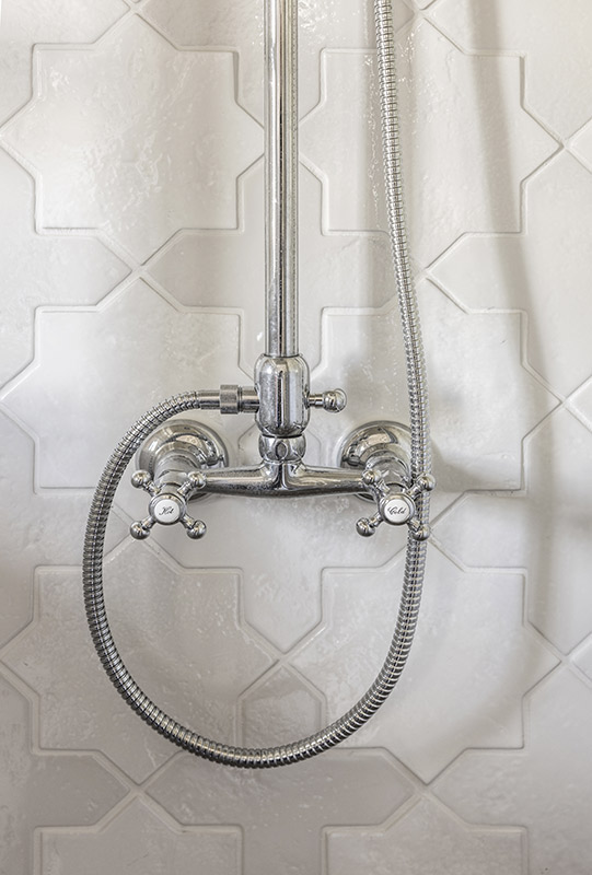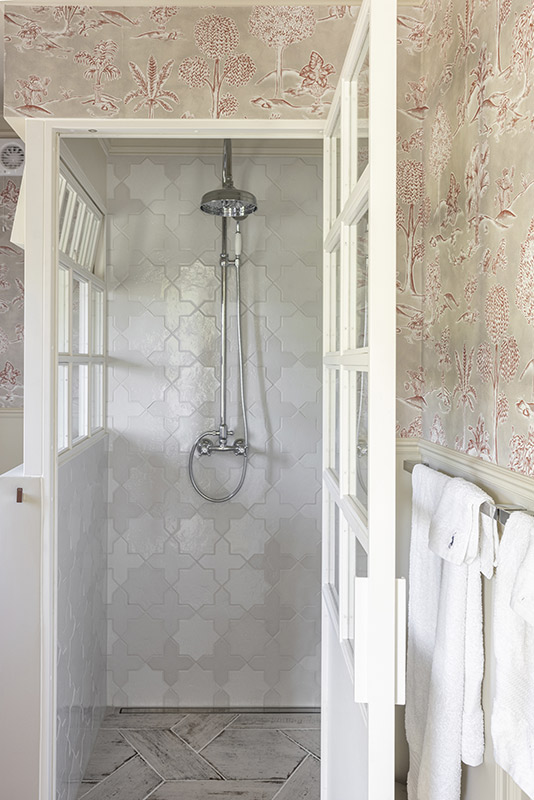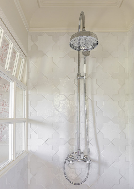 The shower is transformed into a space full of character thanks to the Malta, series cladding, combining Cross and Star pieces in Snow color.