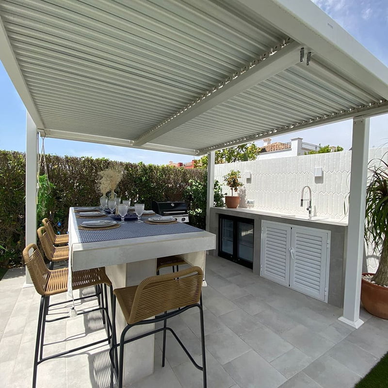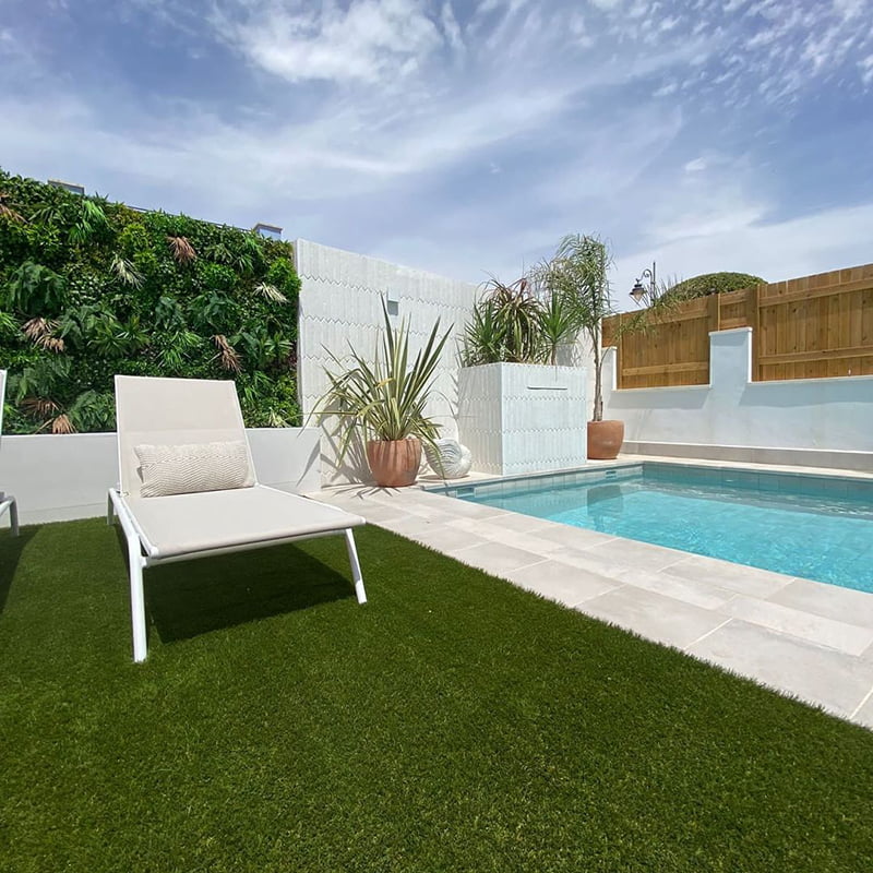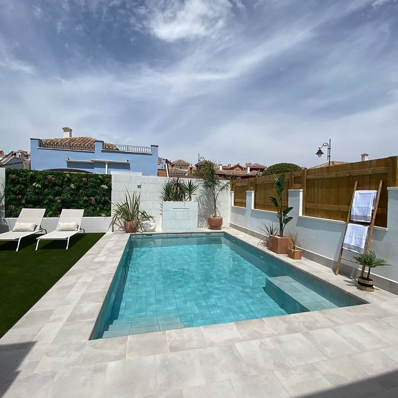 We show you how spectacular has been the reform of the outdoor area in the house of @xusojones designed by Estudio Interiorismo Ana Guillen. In the barbecue area, including the furniture, as well as in the pool, we have used the R11 Memory non-slip extruded porcelain tile, which achieves a natural effect that conveys peace and tranquility, which was the main objective in the design of the project. Memory offers aesthetic continuity between the terrace and the pool basin, thanks to its special pieces with the same finish as the rest of the tiles, creating a bench inside the pool that is ideal for meetings in the water.