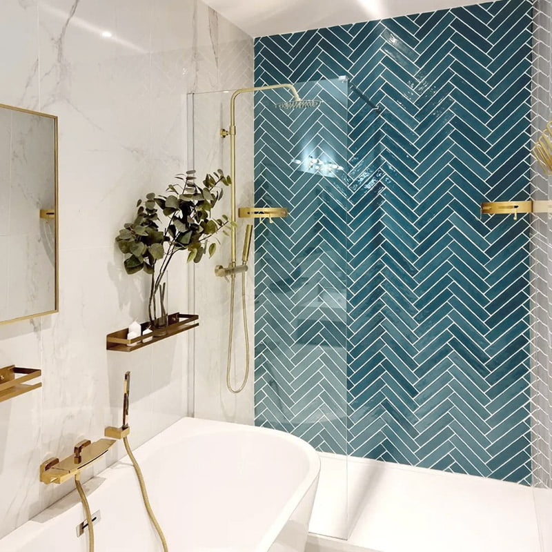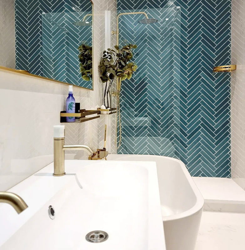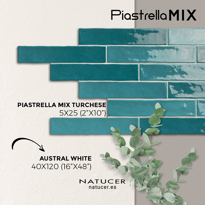 The edges and irregular surface of Piastrella Mix Turchese provide a handcrafted look in this bathroom with materials supplied by As de Carreaux. Piastrella Mix is a untoned white body cladding that gives light and diversity in its laying forms.