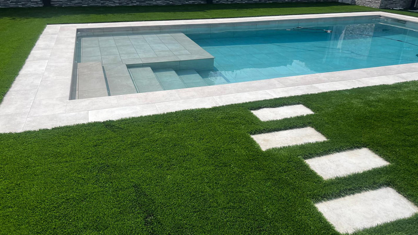 This private pool project features our EVEREST NIEVE collection, an extruded porcelain tile with a stone-effect finish—ideal for outdoor and wet areas. The 30x60 cm format covers the pool interior, while the 60x32 cm step piece ensures a safe and refined edge. Its antislip surface provides added safety around water.