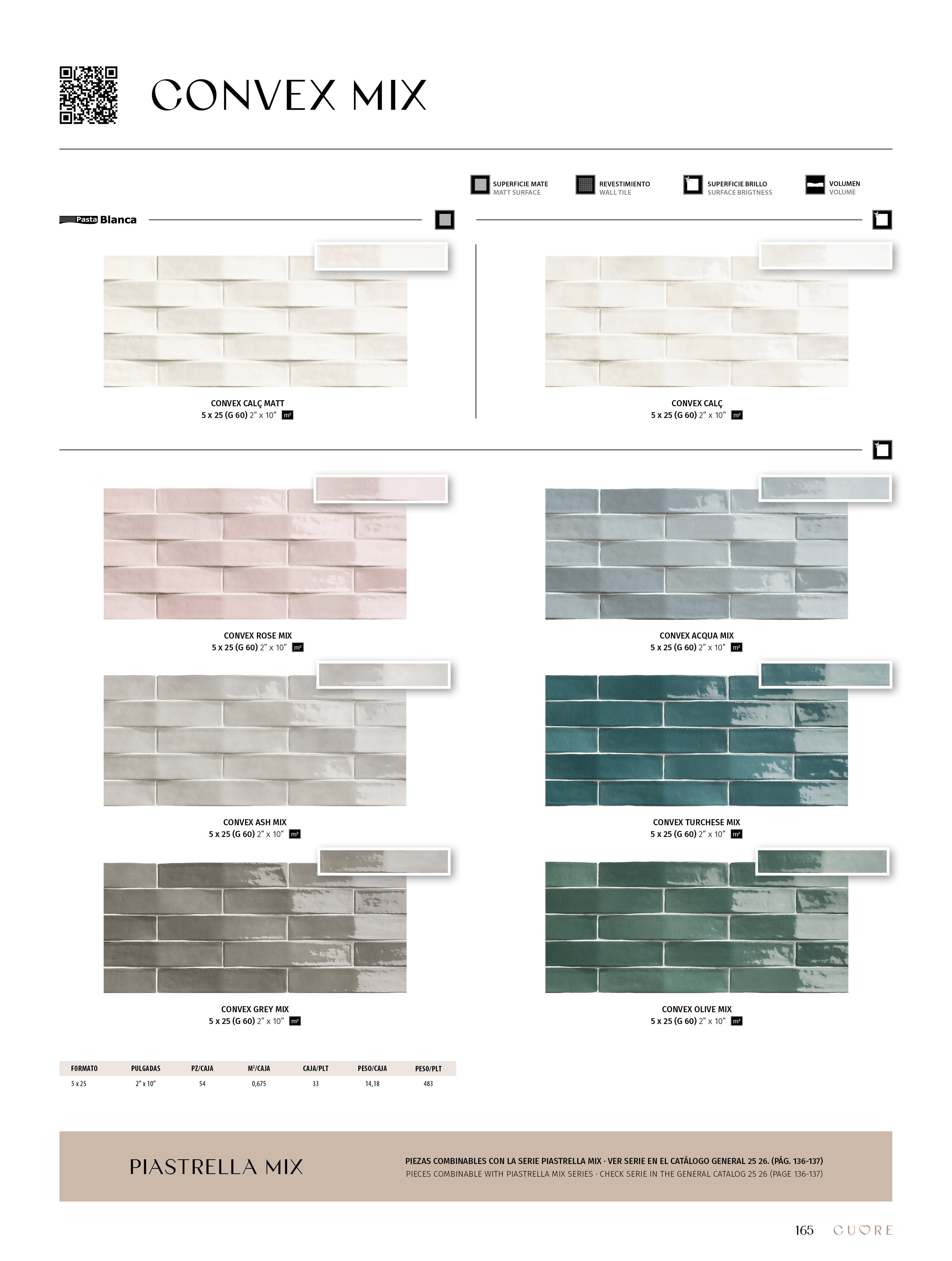 Convex Mix es un revestimiento con efecto artesanal, carácter, volumen tridimensional y superficie acabada en brillo que dota de un estilo clásico renovado, ofreciendo un impacto visual y emocionante inspirado en los azulejos tradicionales.