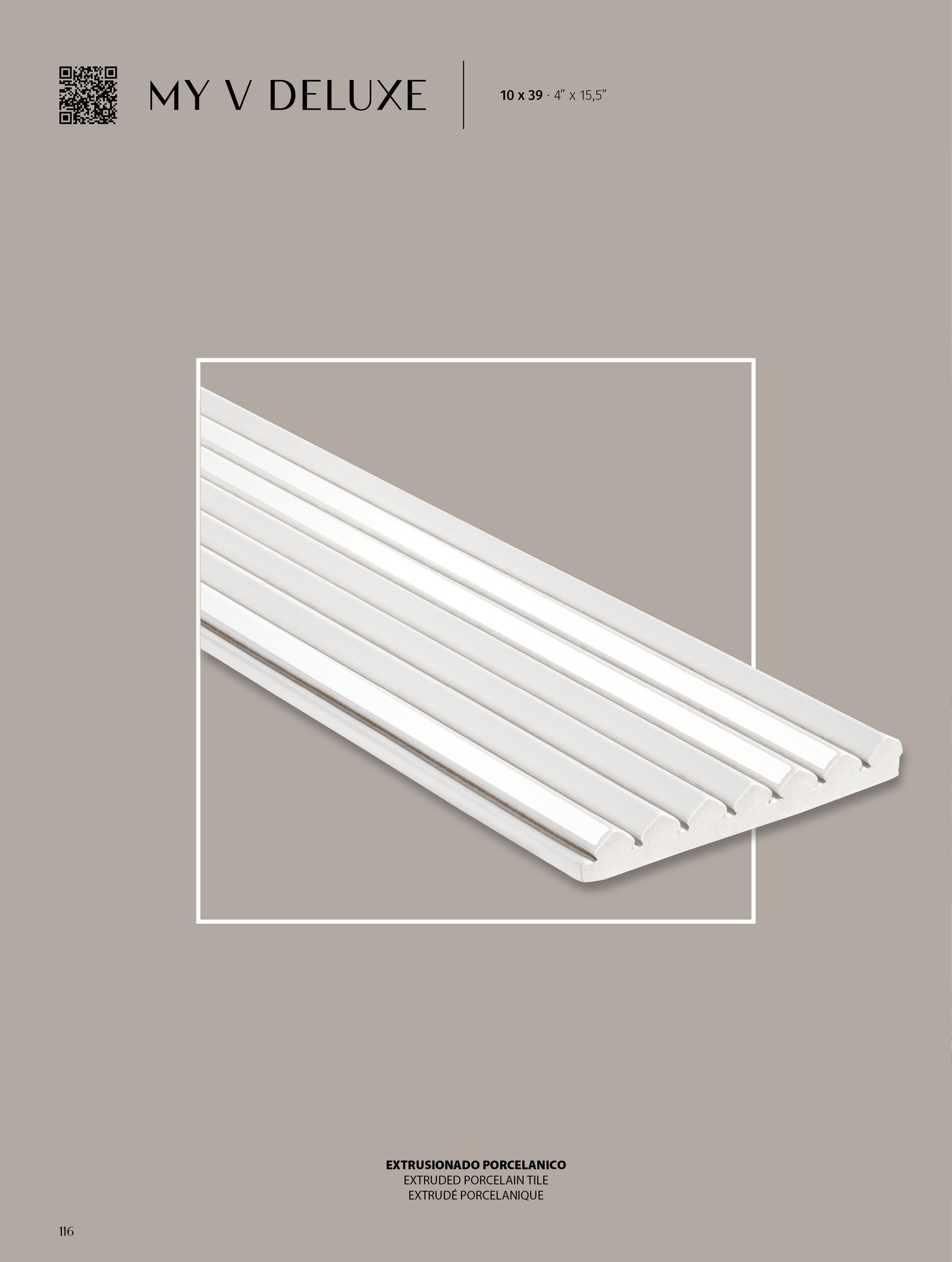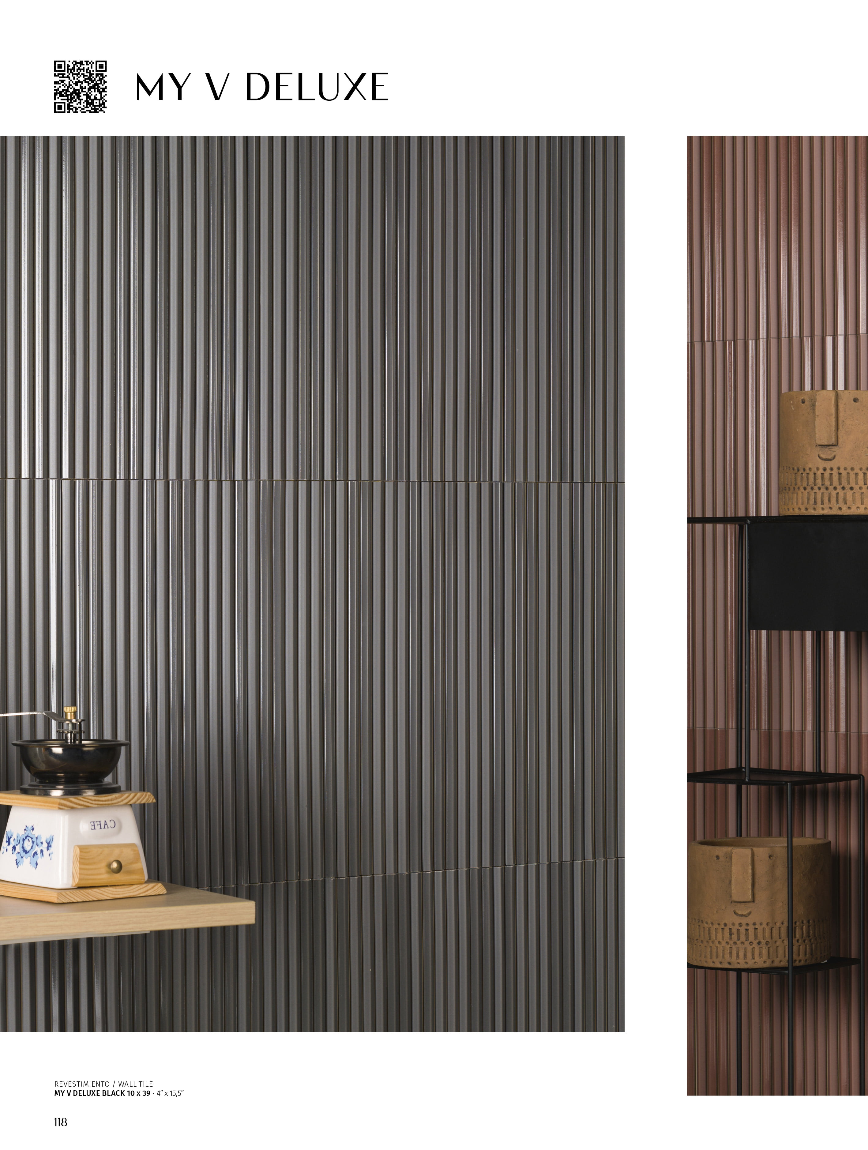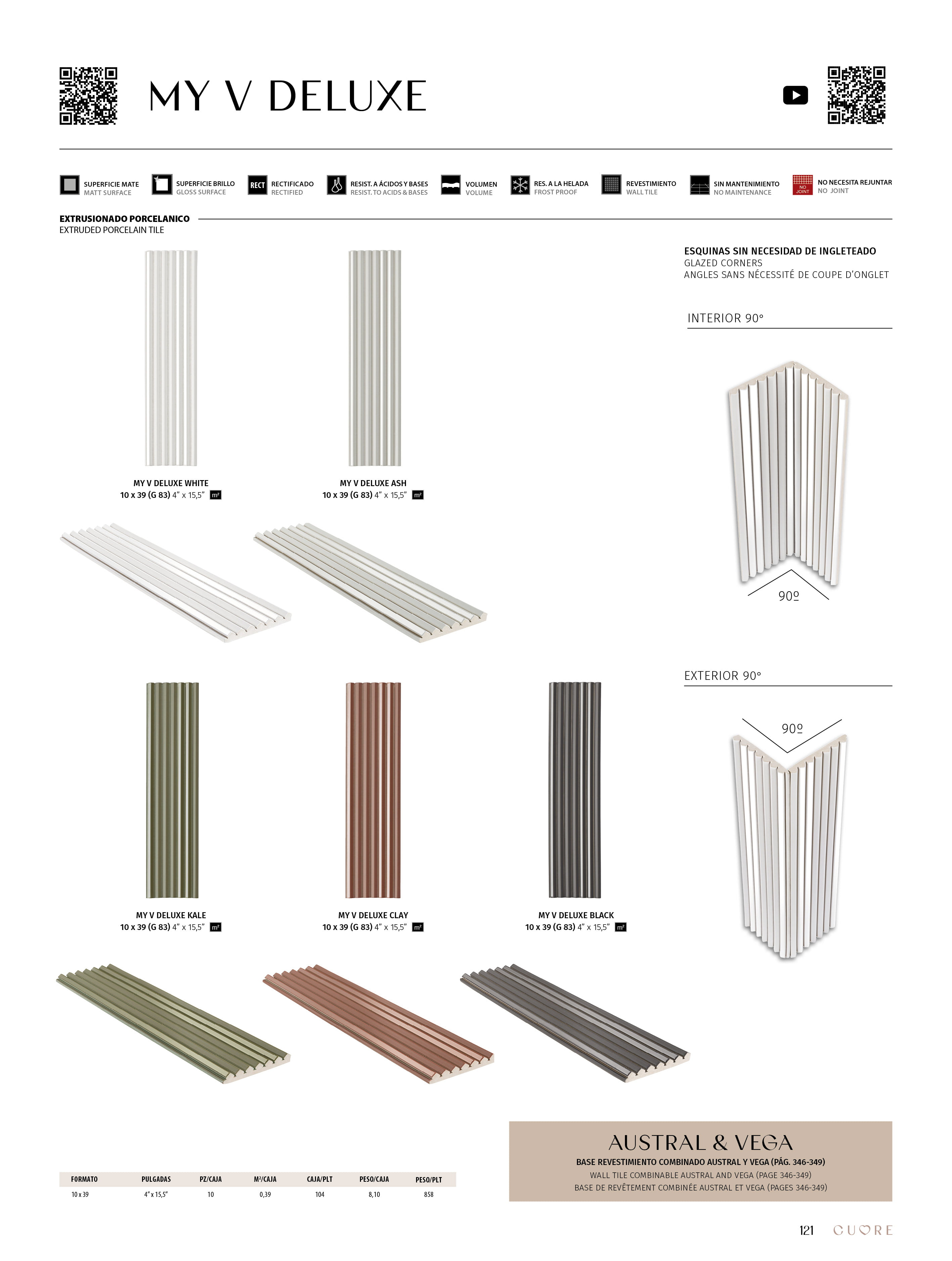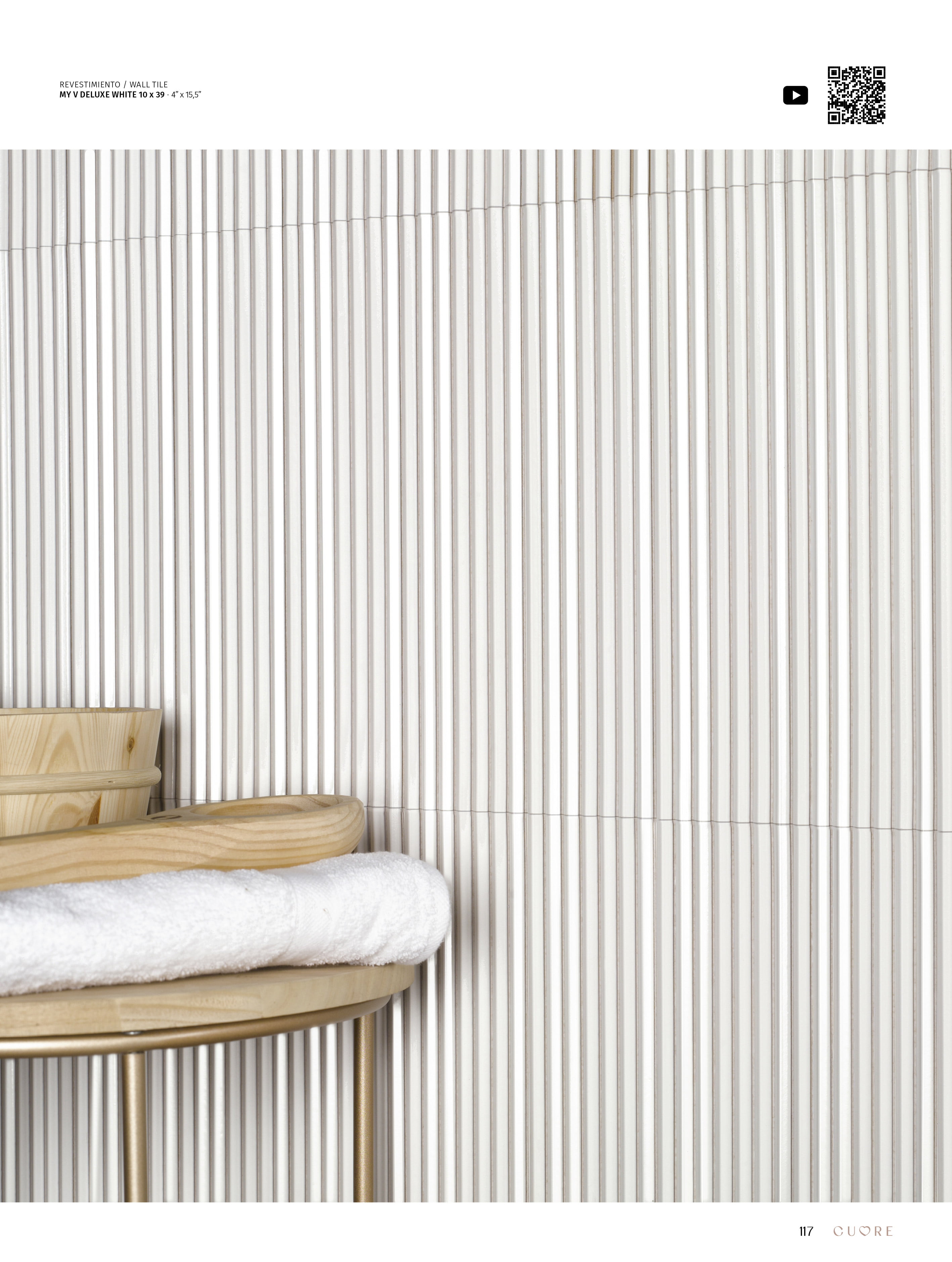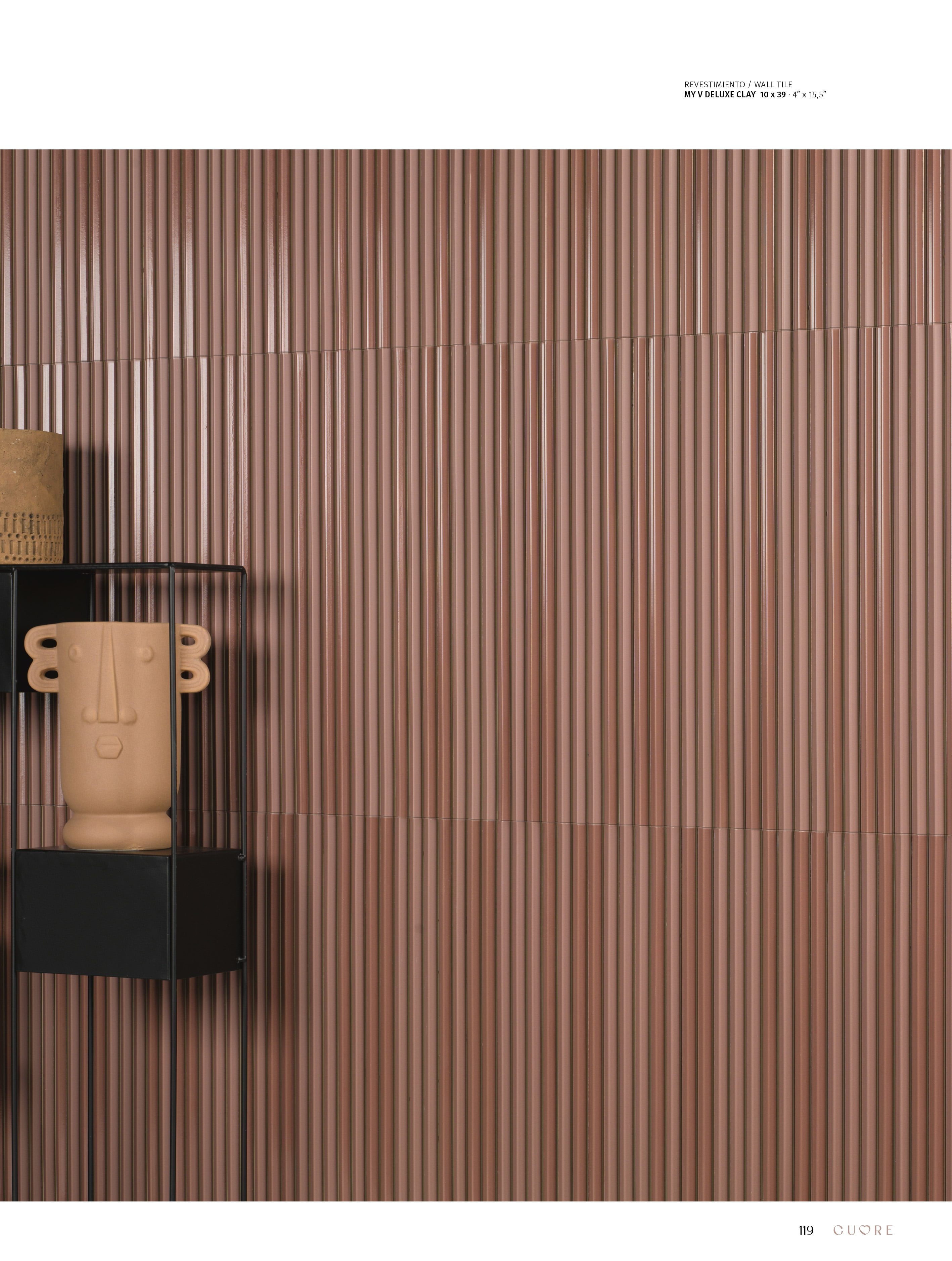 La nueva serie de CUORE by Natucer, My V Deluxe, se inspira en los trazos geométricos y minimalistas, dejando como resultado una pieza con aires Art Deco. Sus delicados surcos generan un movimiento casi senoidal que da vida a nuestras paredes. Al combinar el acabado brillo con el mate en una misma pieza, disfrutamos de un espectáculo visual de luces y sombras. My V Deluxe es un azulejo de porcelánico extruido, esto hace que sea funcional tanto en interior como en exterior. Su modularidad y sus diferentes formas de colocación, lo hacen perfecto para dar personalidad a cualquier estancia. Cuenta con una gama de colores de gran presencia que transformará cualquier rincón en un lugar icónico.
