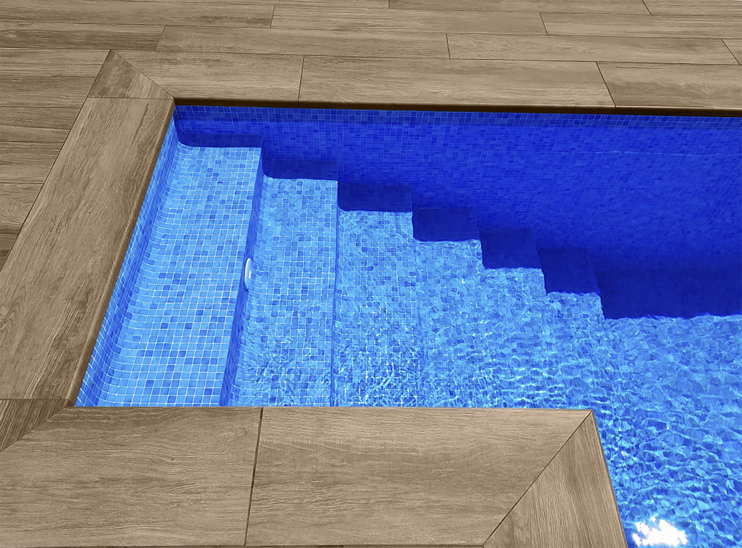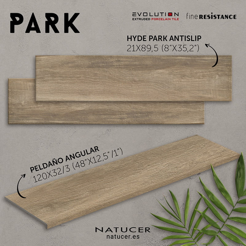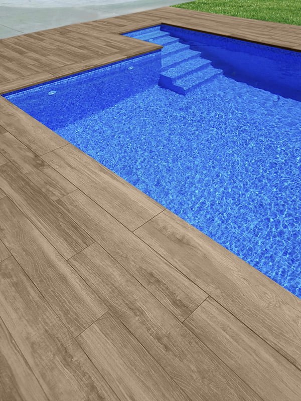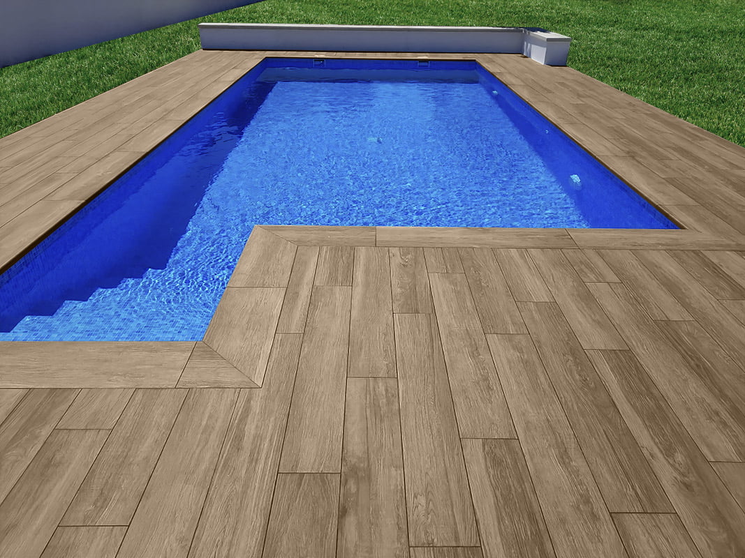 Park proporciona un acabado perfecto con toda una serie de piezas especiales como el peldaño 120 utilizado en esta piscina en Pontevedra. En la playa de la piscina se ha elegido Park Hyde 20x120 un porcelanico rectificado antideslizante R11 Clase III que con su apariencia de madera crea un espacio en el que conectar con la naturaleza. Los materiales para la construcción de esta piscina fueron suministrados por Laguardia & Moreira situada en A Guarda.