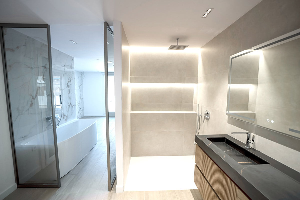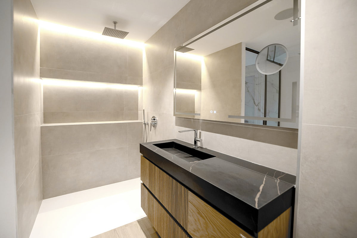 Ubicado en Albacete, este piso de nueva construcción cuenta con la colección Olimpo en el baño, convirtiéndolo en un espacio elegante y moderno. Las paredes están revestidas con piezas de porcelánico extruido en un tono crema, que aporta calidez y serenidad al ambiente. Con un formato de 60x120cm, estas piezas destacan por su acabado mate y bordes rectificados, logrando un diseño limpio y contemporáneo. La superficie suave y uniforme refleja la luz de manera sutil, realzando la amplitud del baño y generando un entorno de serenidad.