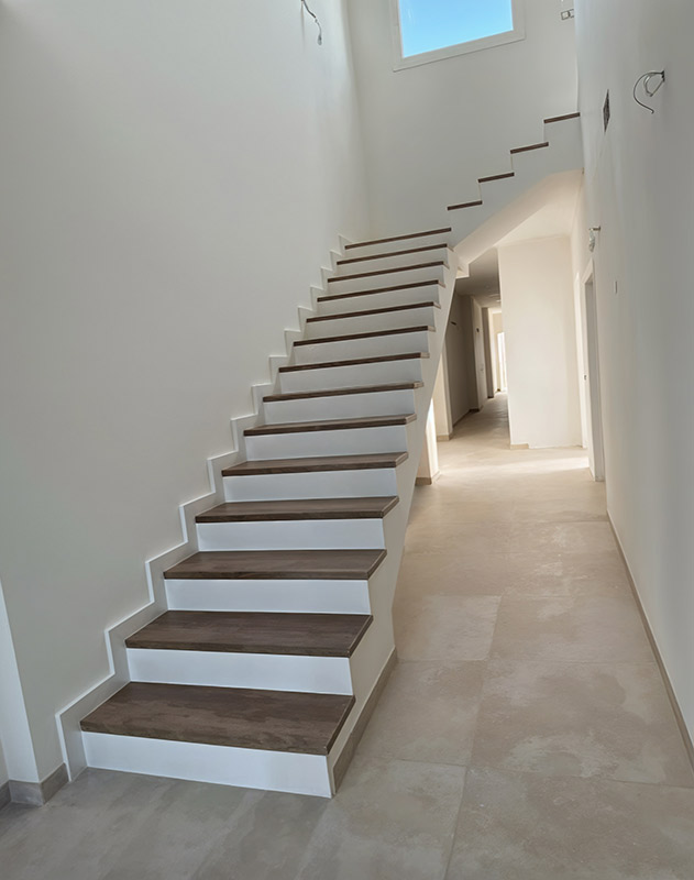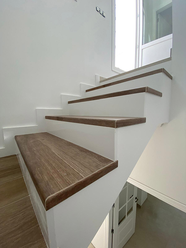 Nos encanta el resultado de estas escaleras creadas con la colección PARK, que aportan una armonía única al espacio. Es la elección ideal para revestir tanto el suelo como las escaleras de esta casa. Gracias a su peldaño porcelánico extruido de 120 cm, se ha logrado una integración perfecta con el diseño general del entorno.