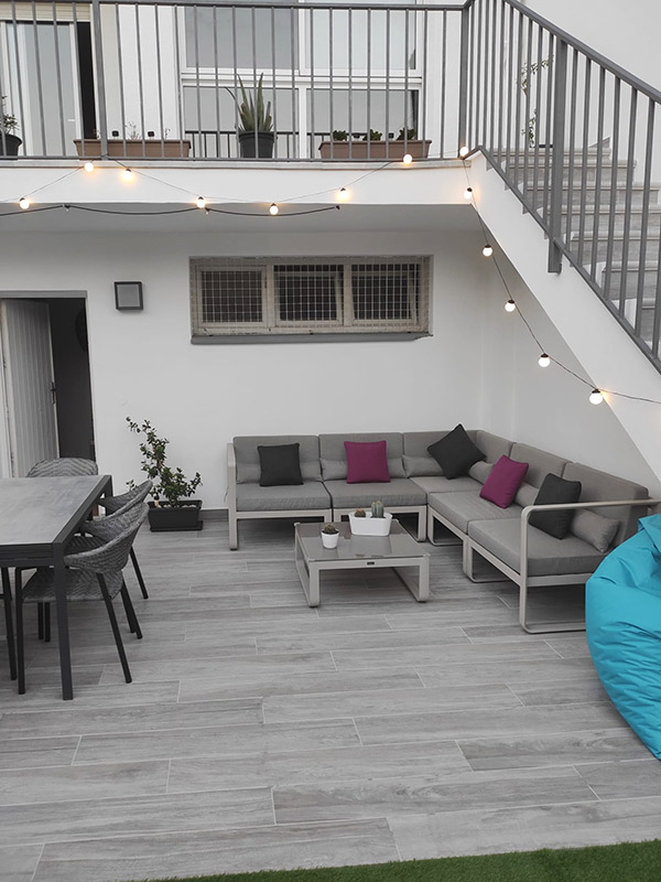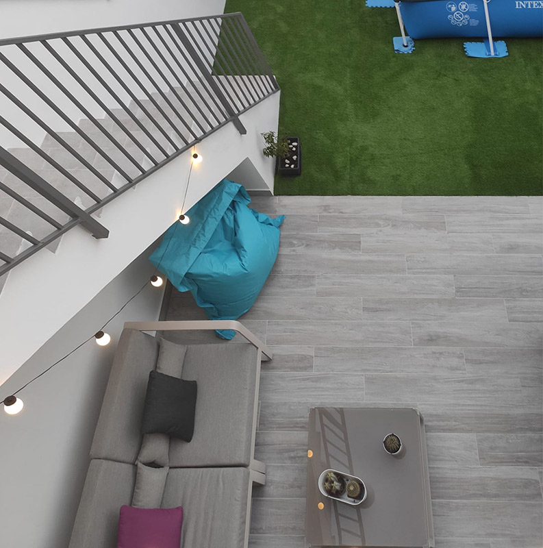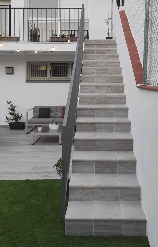 Esta elegante terraza ha sido diseñada con la colección PARK de Natucer, una serie de gres porcelánico extrusionado que reproduce fielmente las vetas y nudos de la madera noble, aportando una estética natural y sofisticada al espacio.