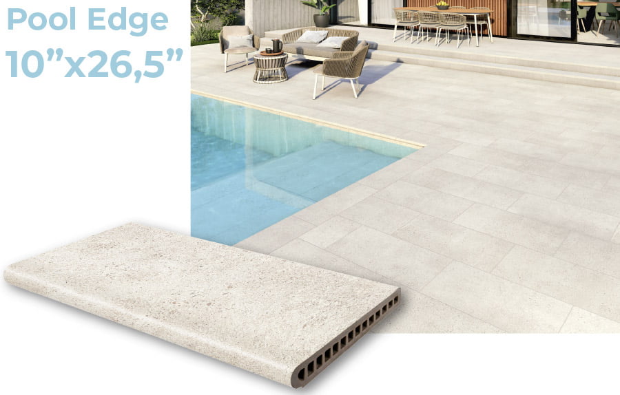Another solution for skimmer pools is the pool edge, a unique and robust piece that prevents water from spilling out, thanks to its design.