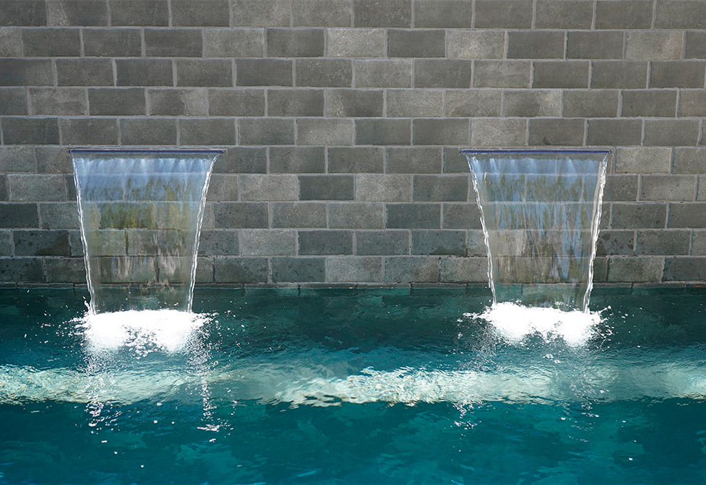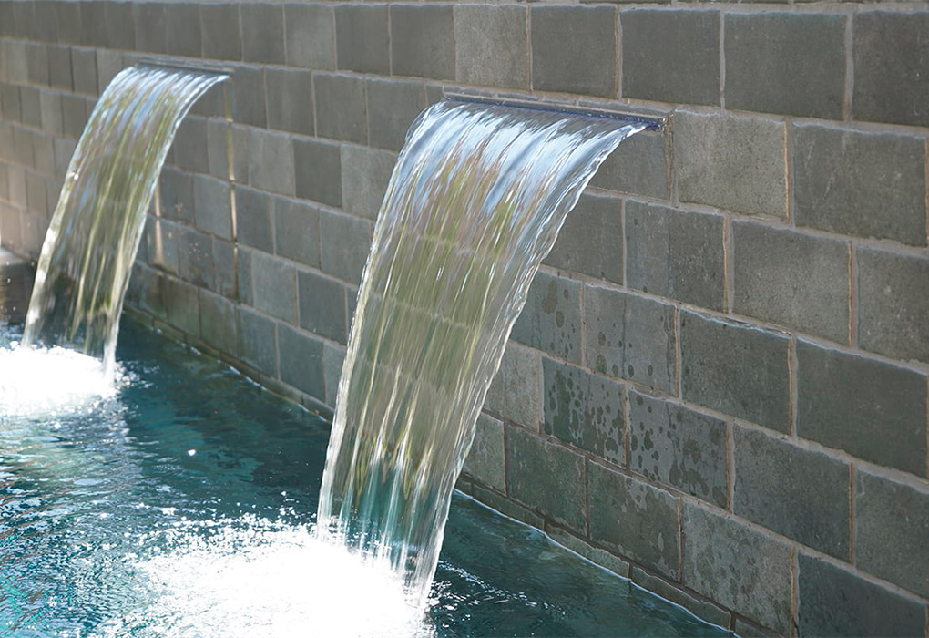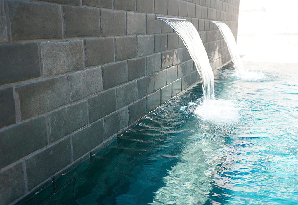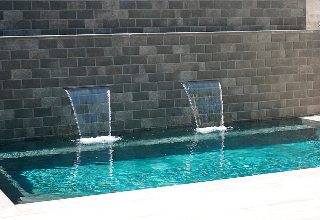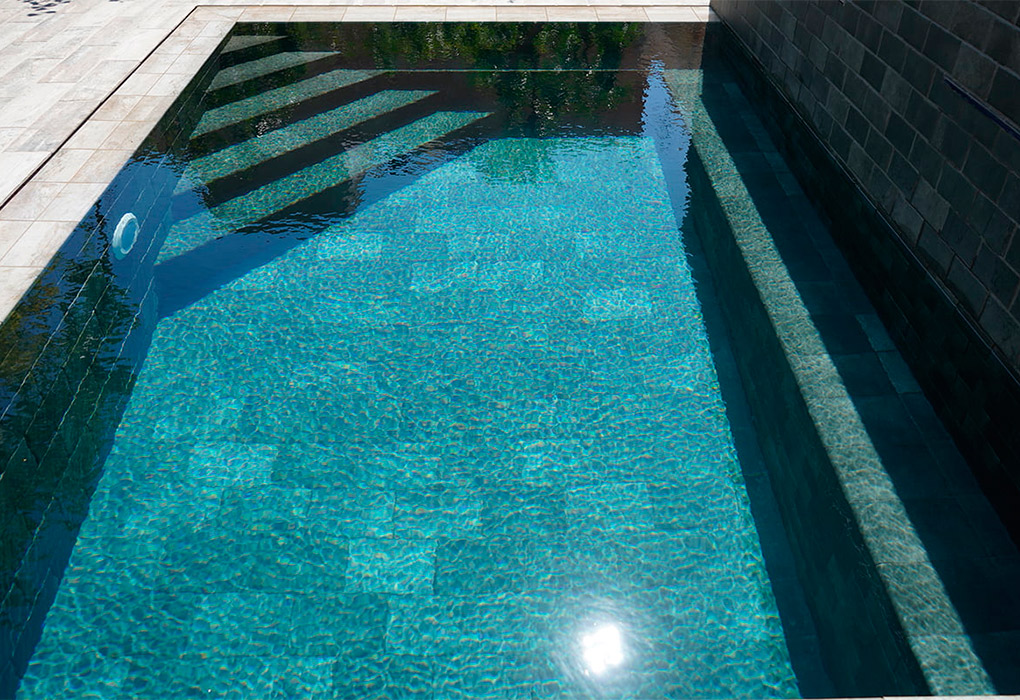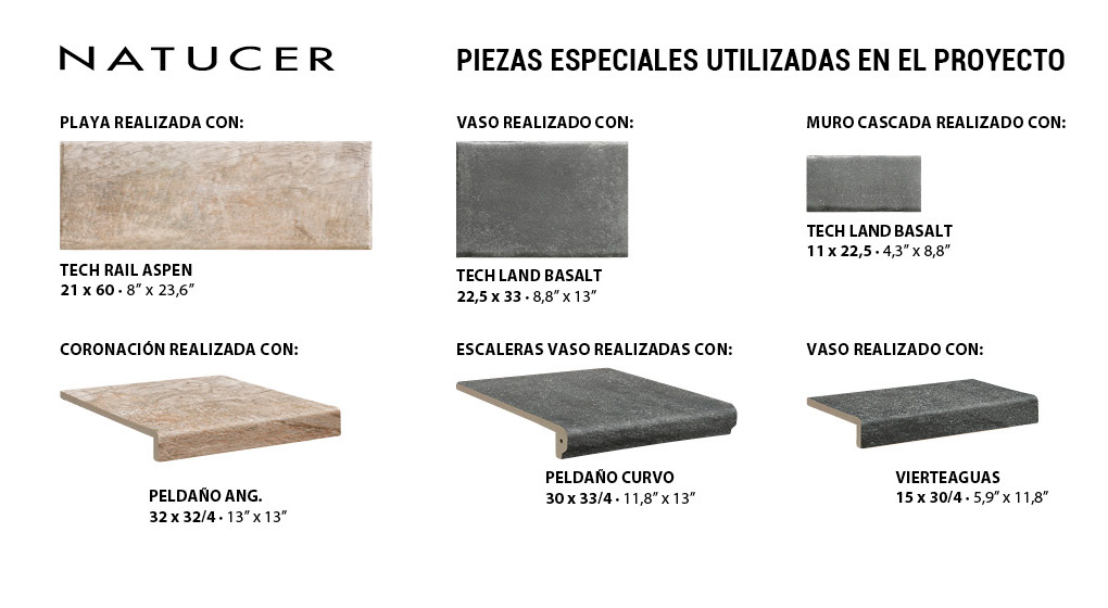 The Tech Land Basalt porcelain in 22.5×30 cm format has been used for the swimming pool’s glass, which adds a more urban and versatile touch to the room. The pool consists of an interior staircase made from the curved step from the Tech Land Basalt collection and an interior bench that occupies the entire front wall, which shows two waterfall inserts that produce a natural environment in which to sit and relax. The wall has been created with the 11×22,5 cm format from the Tech Land Basalt series and finished off with the 15×30 cm gutter, also available in this collection, to create a flower box, while the bench is composed of the curved step and the ceramic tile from the Tech Land Basalt collection in the 11×22,5 cm format.