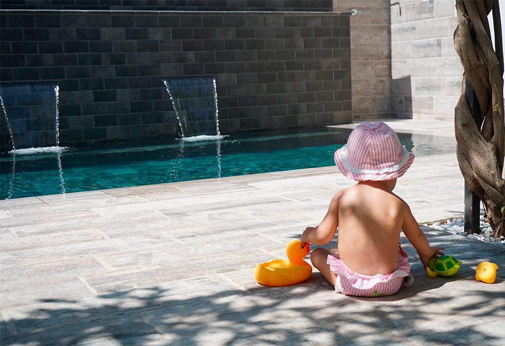 The turquoise colour of the water is due to the incidence of the sun on the grey pieces of the Tech Land collection. This tile reveals a special finish as the characteristic roughness of the anti-slip product has been eliminated, obtaining a fine and smooth surface to the touch. In addition, these tiles have an antibacterial effect, thanks to the Active Oxygen that is produced after the incidence of light, which makes all the organic matter that falls on the surface become inert matter that will be dragged away by the water without difficulty.