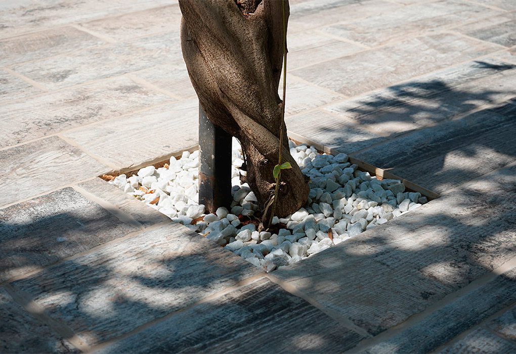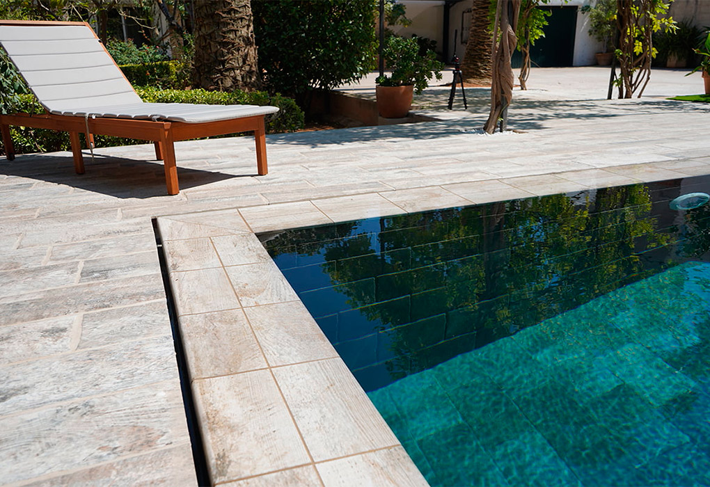 In the area of the beach, the extruded porcelain wood belonging to the Tech Rail Aspen series and with a format of 8×23,6 inches has been chosen. The crown of the pool has been made with two angular steps available in this collection. This non-slip porcelain wood is a good choice when installing on beaches because it is a Class III non-slip material with high technical requirements, thanks to its 14 mm thickness.