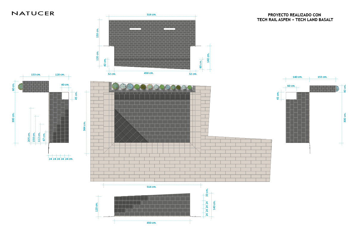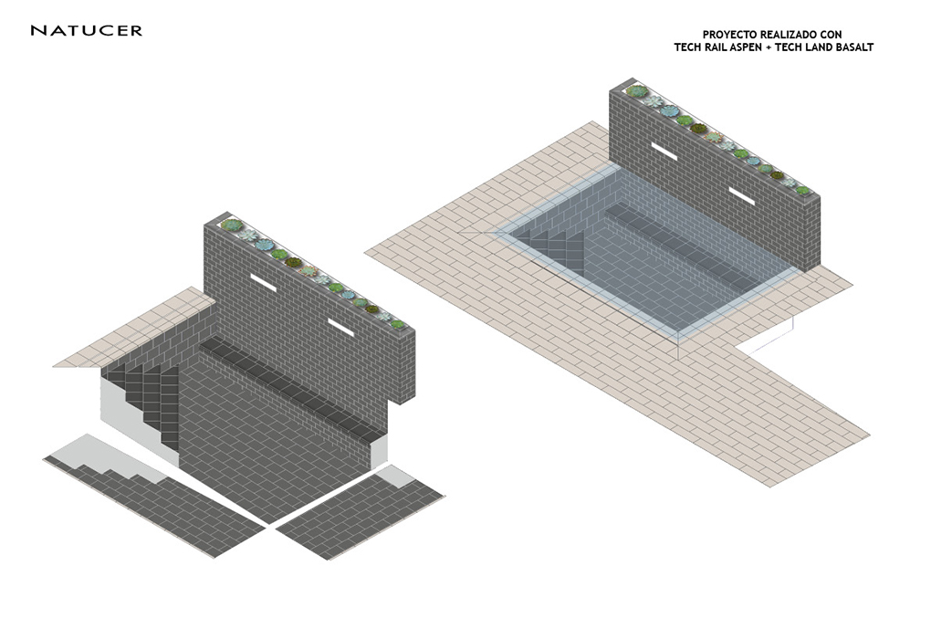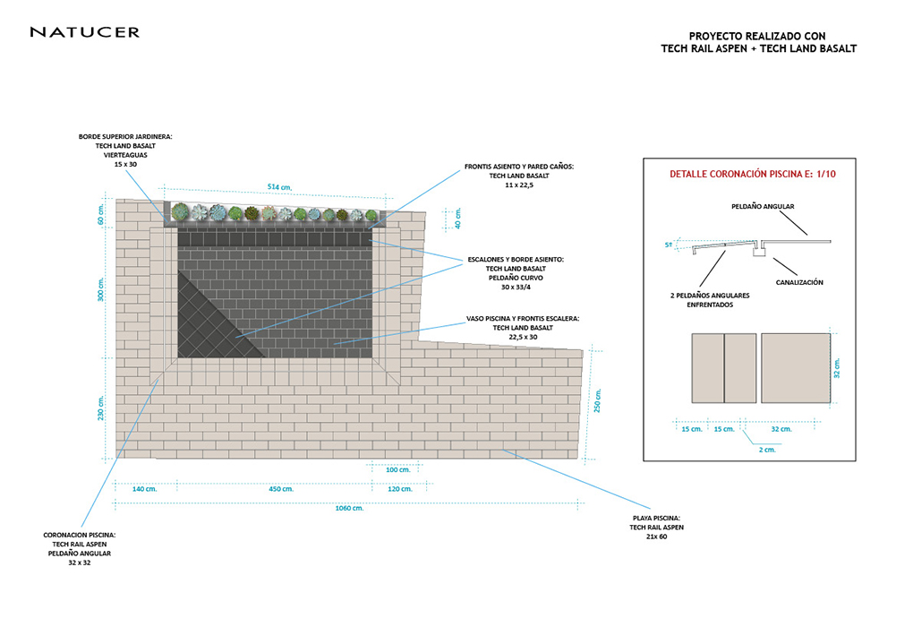 The materials for the restoration of the terrace, creation of the swimming pool and bathroom, have been supplied by Natucer. In the plans made by Natucer, you can see the different forms of placement on the beach of the pool and in the glass of the same along with the wall of waterfall finished with a planter.