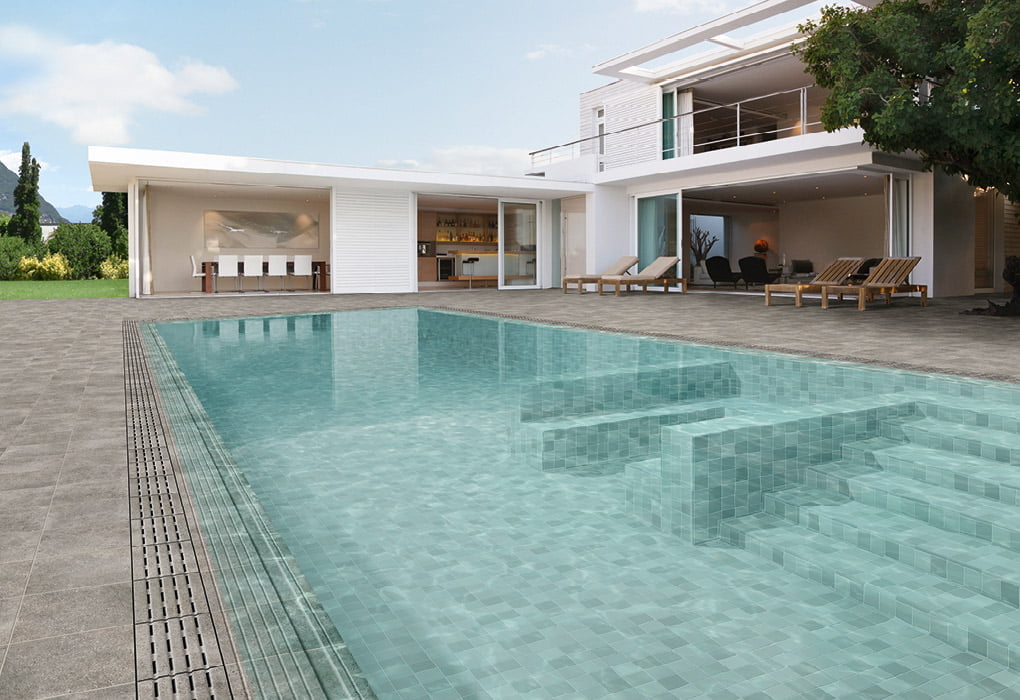 En la pasada feria de Coverings 2019 presentamos nuestro nuevo catálogo de piscinas «Naturpool». En Cersaie 2019 hemos querido aprovechar las opciones que nos ofrece el apartado de revestimiento a través de nuestro producto «Pool» para introducir otra clase de concepto. Con esta serie podrás decorar otros espacios más allá de tu piscina, pues su 10×10 cm / 4”x4” destonificado en porcelánico de extrusión sirve también para baños, cocinas y otras áreas. También se puede adquirir enmallado en 30,5×30,5 cm / 11,8”x11,8”.