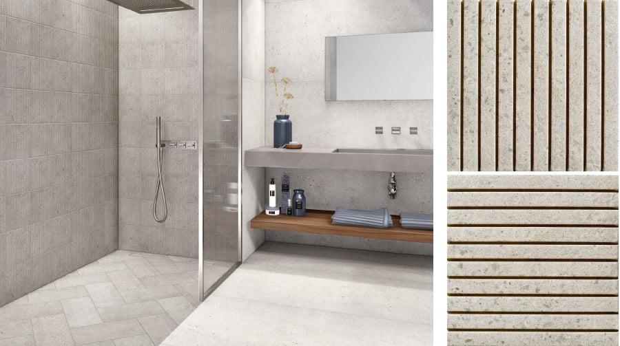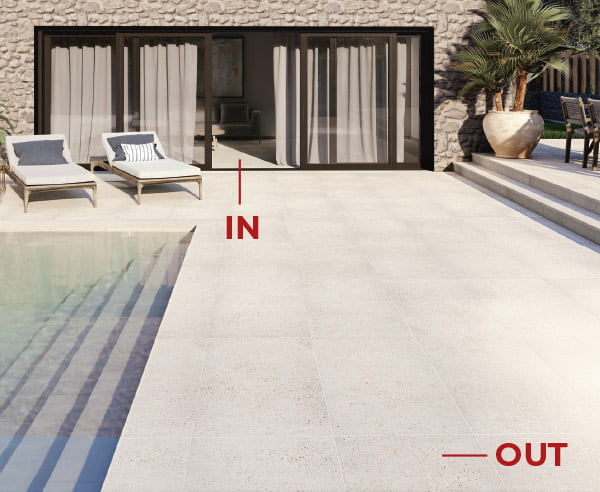 Un formato grande y elegante, en gres porcelánico rectificado, con acabado natural y suave para el interior, y tres formatos más en porcelánico extrusionado y alto grado antideslizante para el exterior. Diferentes características técnicas, pero con idéntica estética para una continuidad perfecta.