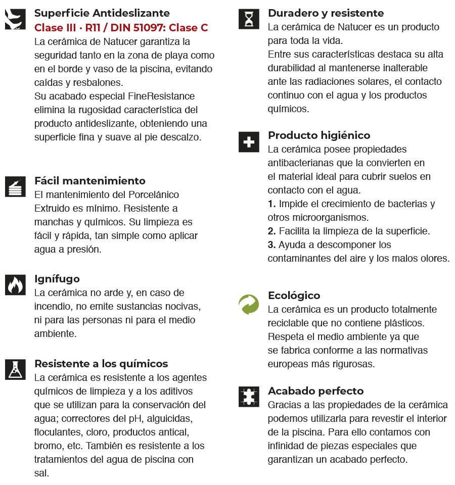 El porcelánico extruido nos proporciona todas las garantías de durabilidad, antideslizamiento, higiene y seguridad que precisa una piscina privada. Donde las posibilidades de diseño son INFINITAS. Capaz de imitar cualquier textura; piedra, barro, madera, cemento…